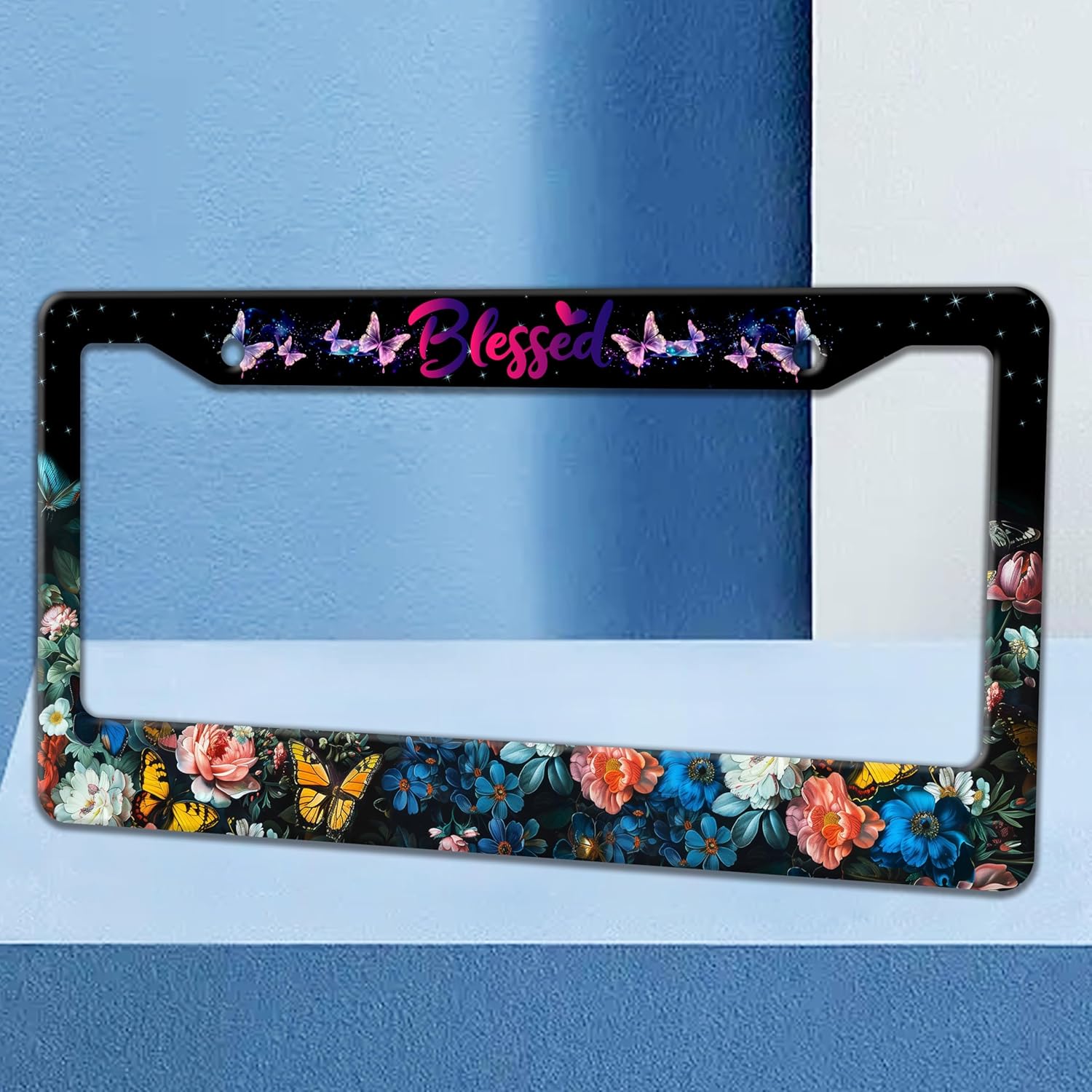 Blessed License Plate Frame Beautiful Butterfly Flowers License Plate Holders Funny Stainless Steel Auto Accessory Bracket 2 Hole with Screws Universal Us Car License Plate Frames 6x12 Inch