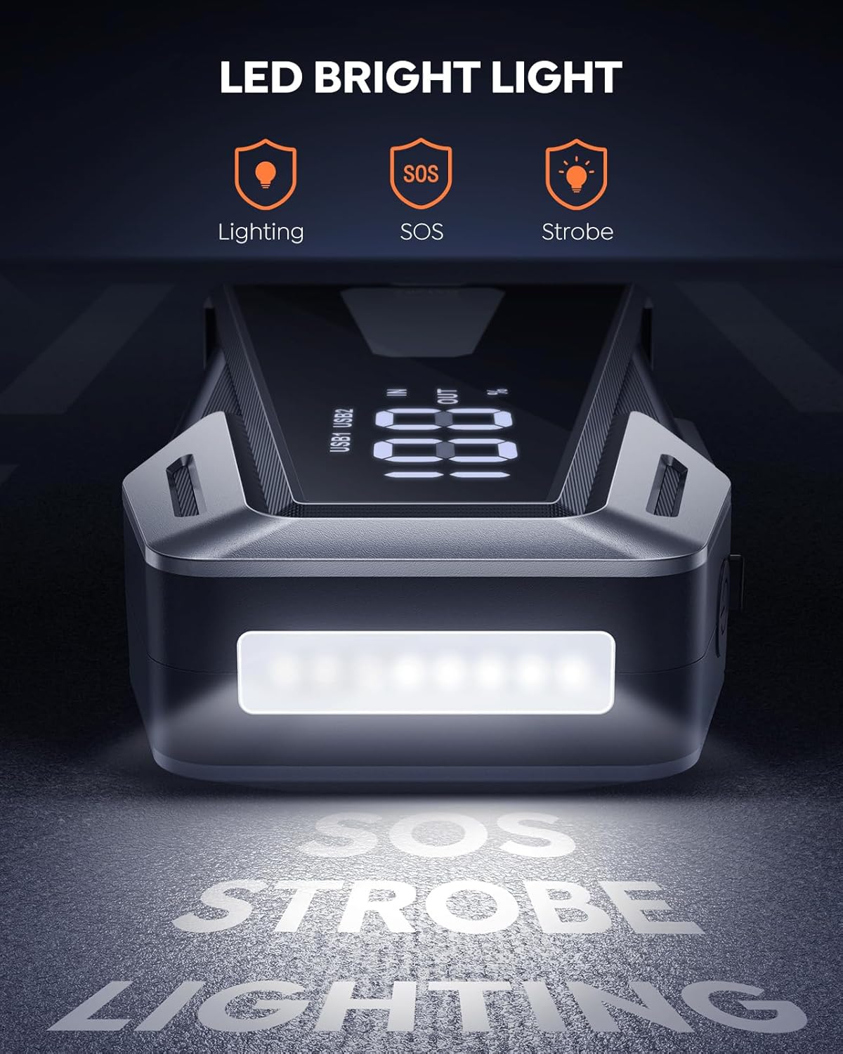- ăAdvanced Large Displayă5" LCD display enables the operation status of the jump pack and battery power at a glance! The integrated screen design of the fuselage makes the car jump starter more concise and modern, which also has the outdoor protection function of rainproof and dustproof. Metal texture edge promote better durability.