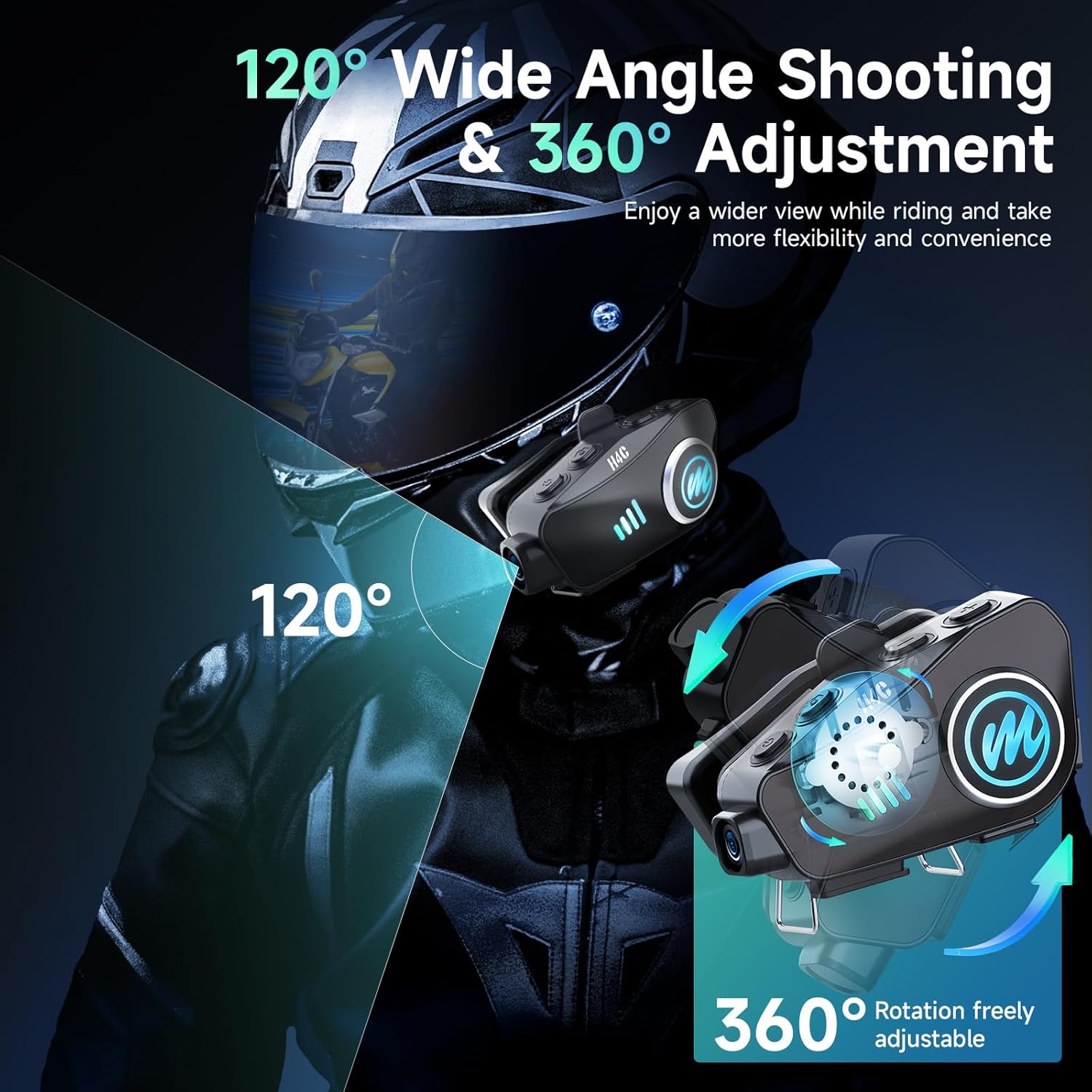 - 【1080P HD Camera & 120° Wide Angle】With a built-in HD 1080P camera, the motorcycle helmet headset H4C clearly records the moments of your ride. The 120°wide-angle lens and 360°body rotation, as well as up to 6.5 hours of recording allows you to capture more details. At the same time. thanks to the convenient WIFI function, riders can simply download the "RoadCam" app on their mobile phones to view and download recorded videos and photos anytime, anywhere.