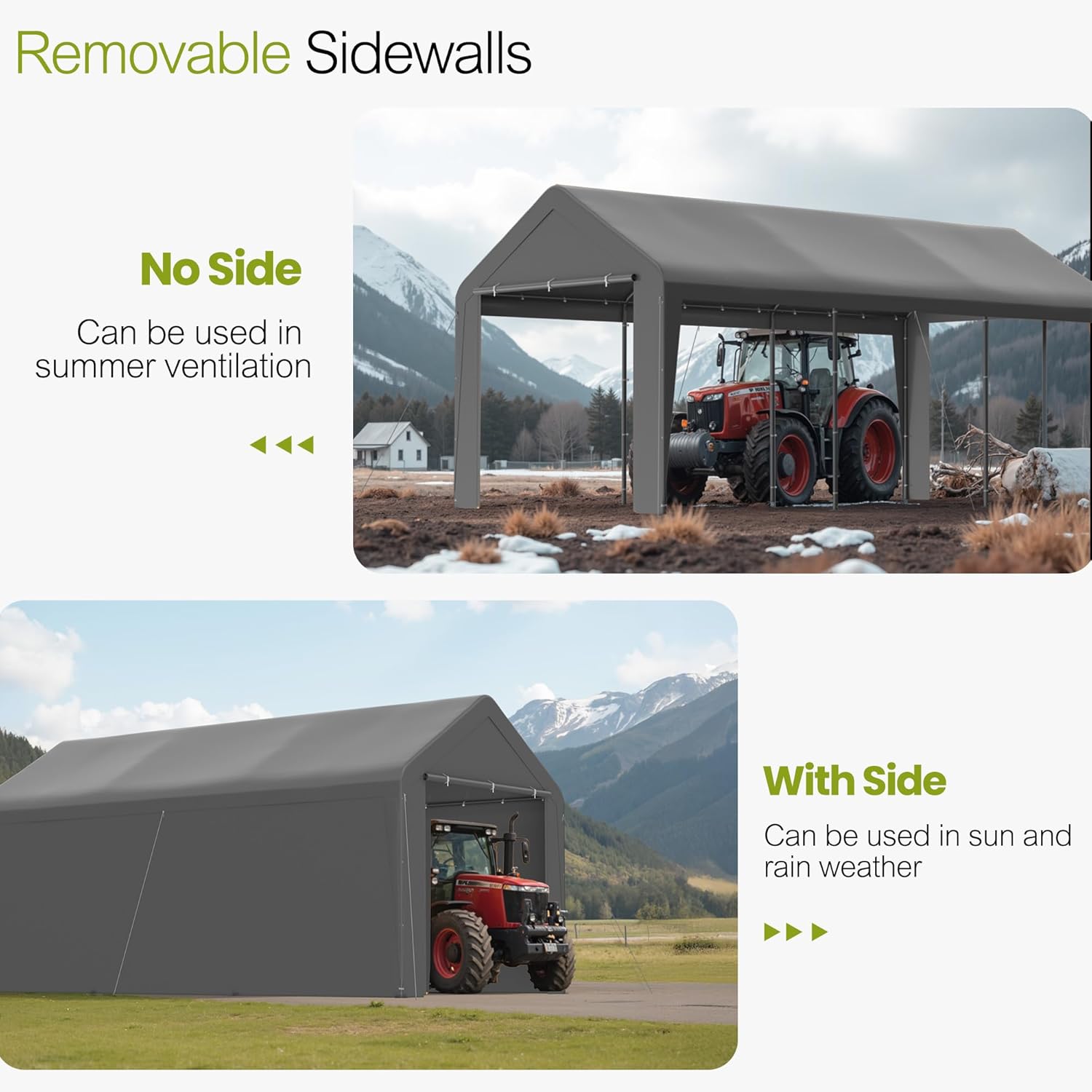 - 【UV & Weatherproof Canopy】This 10x20 carport is made of heat-sealed, triple-layer 200g polyethylene fabric, which is Anti-UV, waterproof, tear-proof, and can protect your car or boats against all four season elements, like sun, wind, rain, dust, hail, and snow.