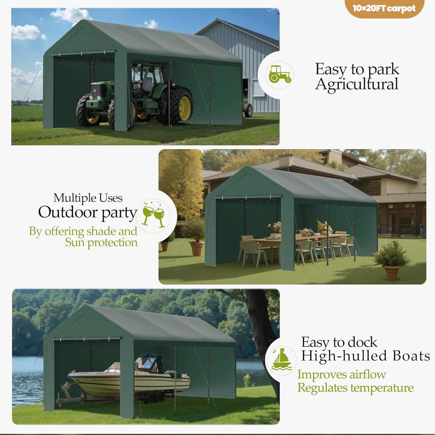 - 【Multipurpose Carport】10'x20' car shelter to create a space at outside, can be used as party tent; car port; wedding tent; portable garage; storage shelter and commercial event tent.