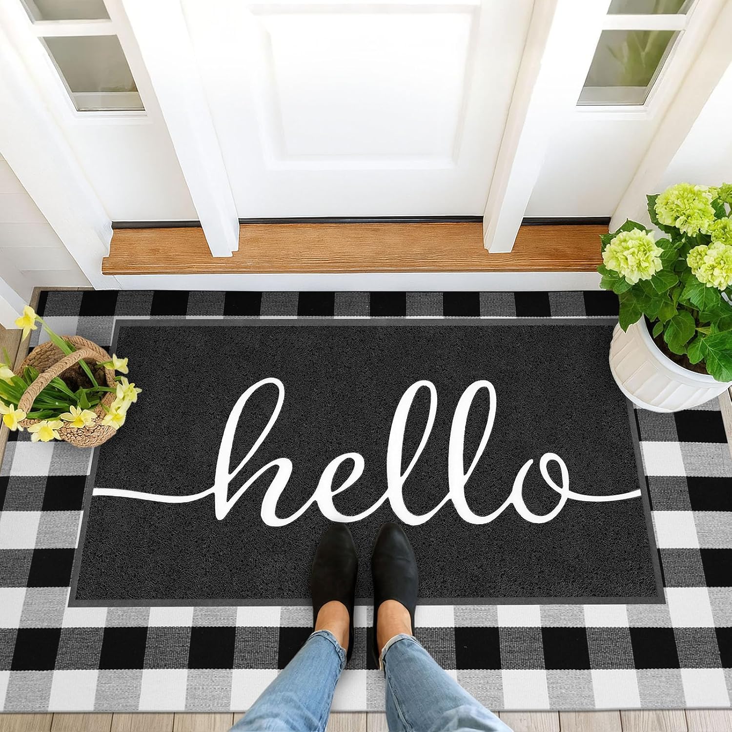 - MULTIFUNCTION USE: The "hello" doormat is perfect for front doors, entryways, patios, garages, laundry rooms, balconies, kitchens, or any high-traffic area. Size: 59" x 35" inch (4'11" x 2'11" feet) for decorating, greeting guests, and as a great gift