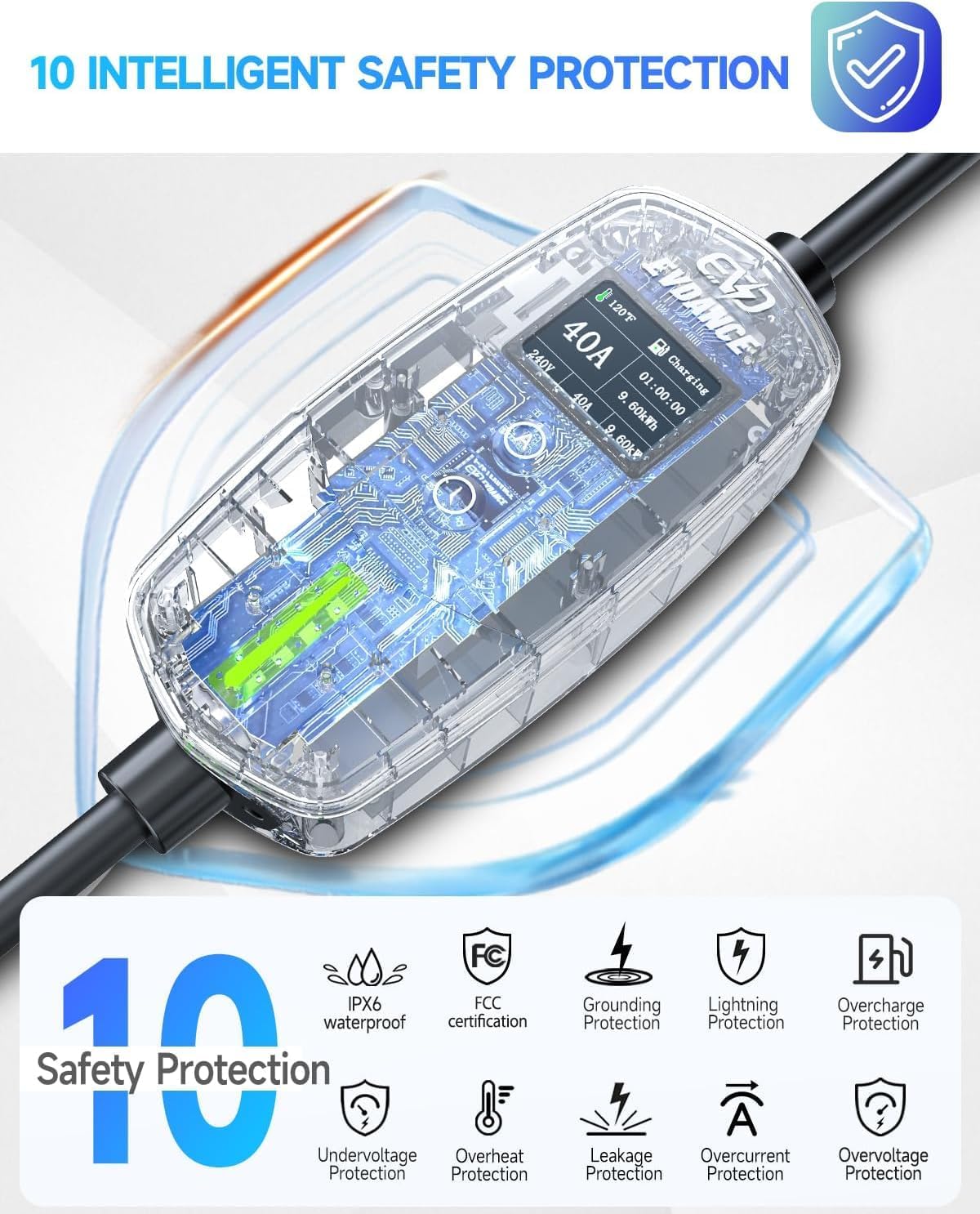 - 🔌 【Adjustable Current for Smart, Flexible Charging】One charger. Multiple needs. With adjustable amperage from 10A to 40A, you can easily match your vehicle’s capacity or your home's power limits. Tap the intuitive “A” button to select your ideal charging speed—perfect for different EV models or fluctuating energy loads.