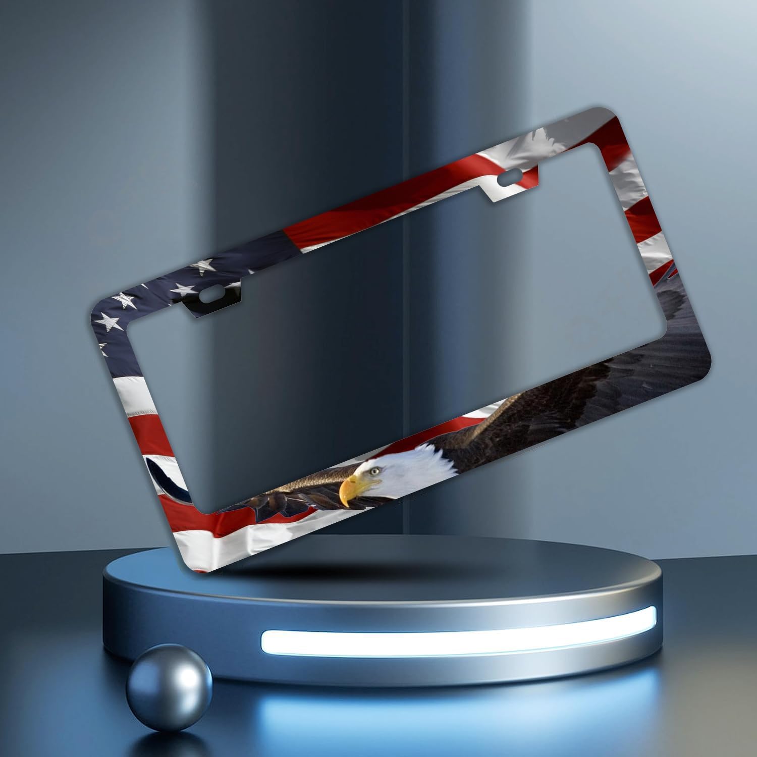 American Flag Eagle License Plate Frames - 2 Pcs Set 2 Holes Stainless Steel Metal Auto Car Accessories Decoration License Plate Frame Cover Size 6.3" x 12.2" Fit US Vehicles for Women Men Gift