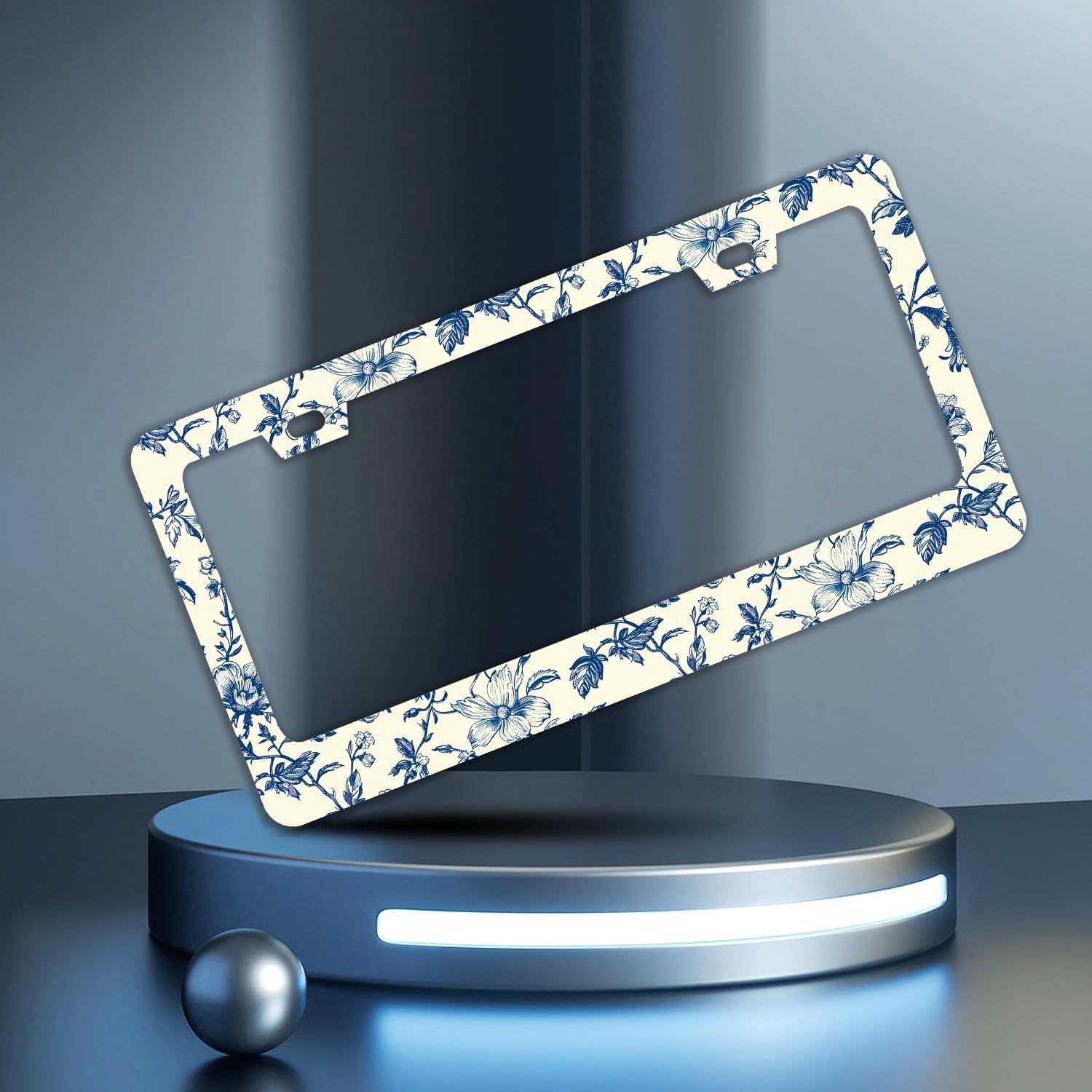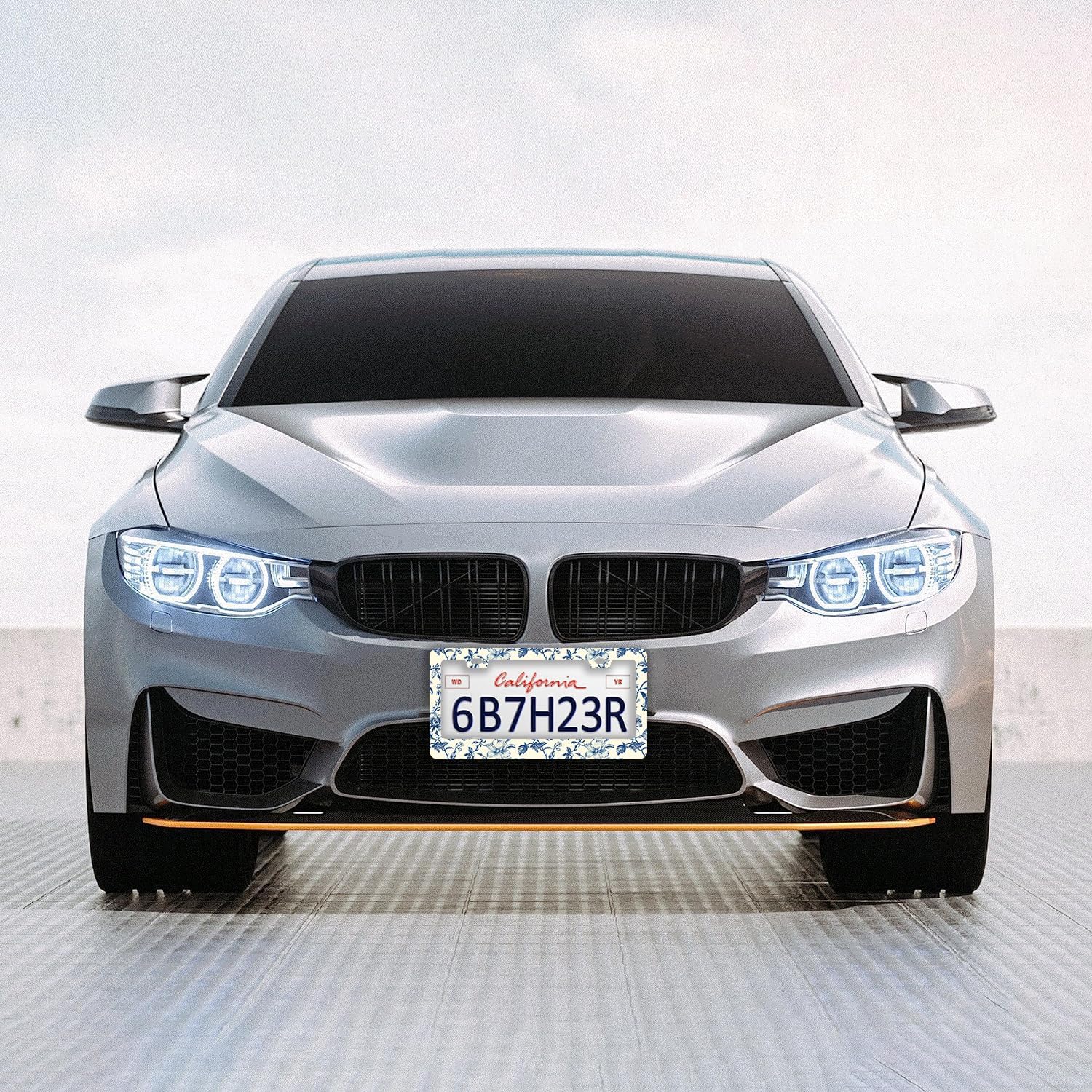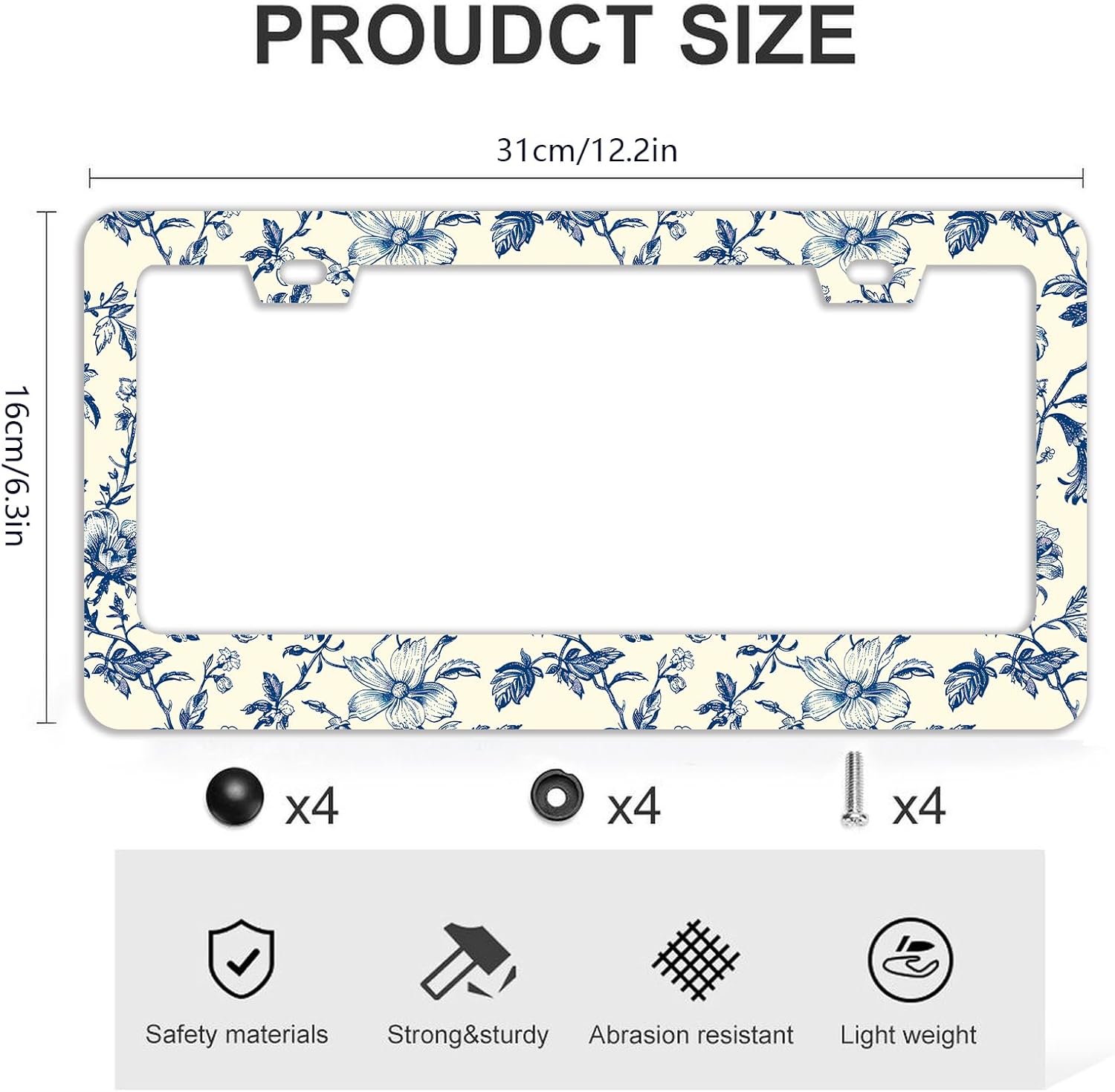 Blue Floral Flowers License Plate Frames - 2 Pcs Set 2 Holes Stainless Steel Metal Auto Car Accessories Decoration License Plate Frame Cover Size 6.3" x 12.2" Fit US Vehicles for Women Men Gift