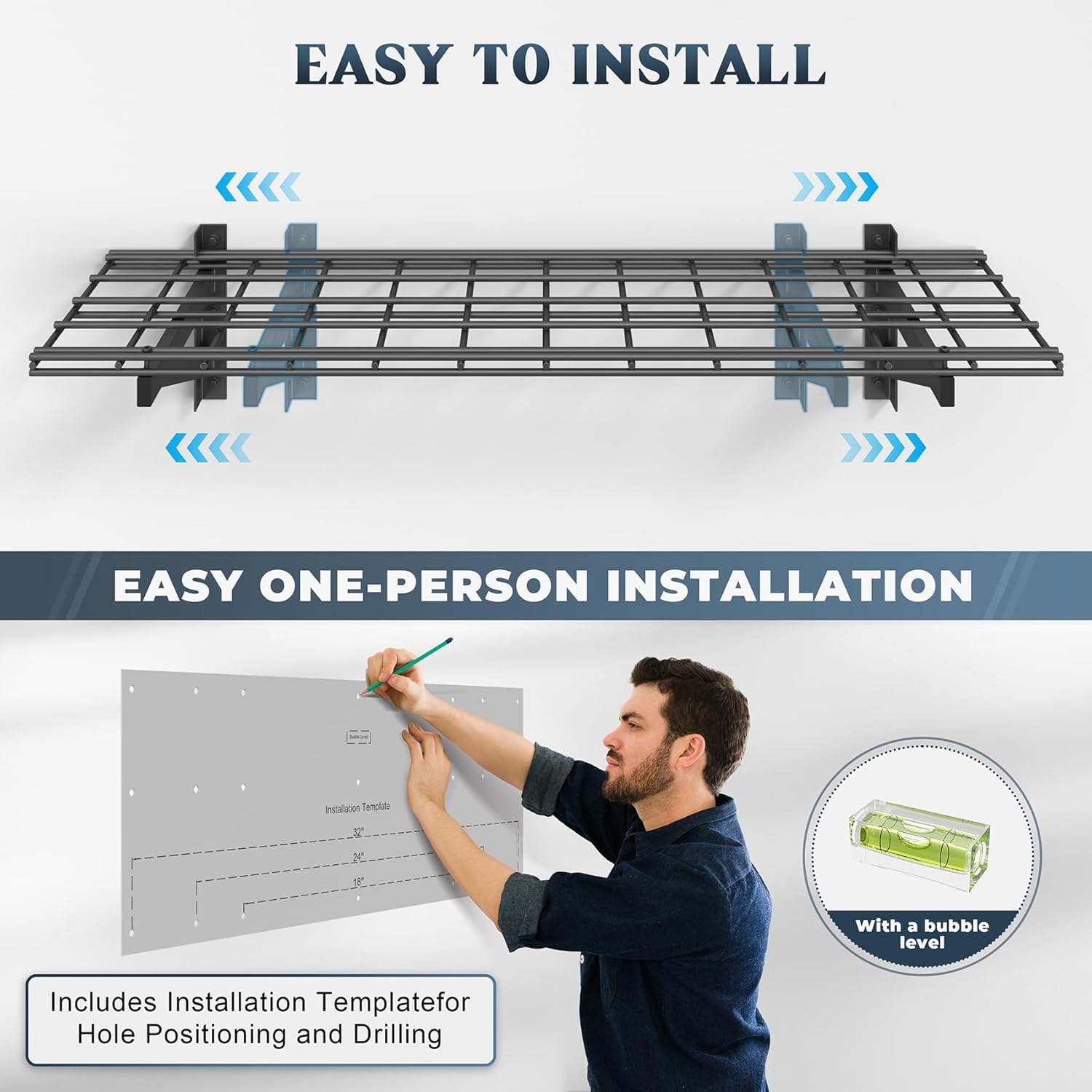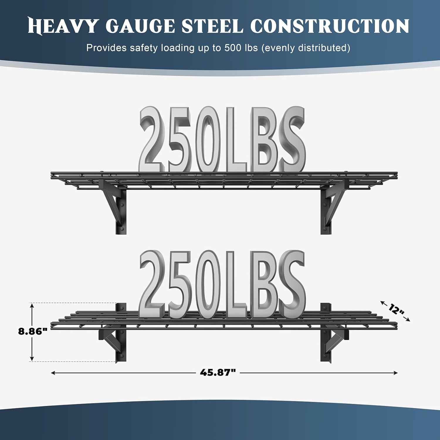 - đăHeavy-Duty Load Capacityă- Jusgym garage shelving wall mounted system is engineered with premium steel, offering exceptional strength. Each 1x4ft bracket holds up to 250 lbs, and with 2 shelves totaling 500lbs capacity, it effortlessly stores bulky items like tools, tires, and heavy storage bins. Built to last, even under extreme weight!