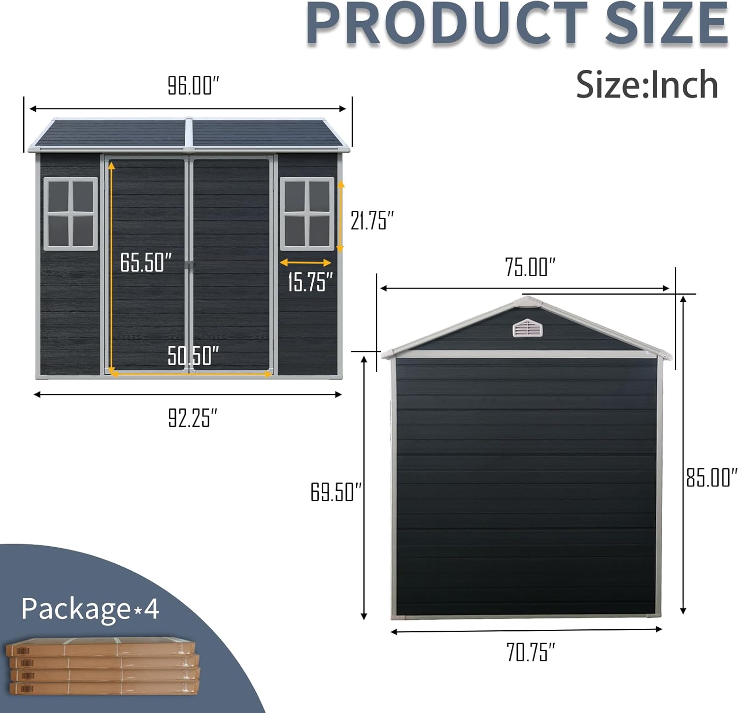 8x6 FT Outdoor Storage Shed, Resin Garden Shed with Thick Floor, Plastic Storage Shed with 2 Windows, Waterproof Outside Tool Shed with Lockable Hinged Doors for Backyard, Patio, Lawn, Black