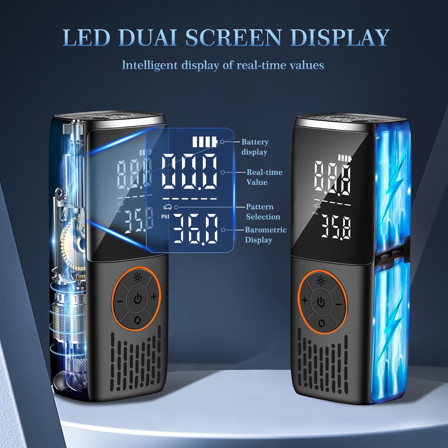- ăPrecision Display & Automatic Shut-OffăEquipped with a high-precision digital pressure gauge and a dual-display screen, this portable air compressor provides real-time monitoring of both current and target pressure values, ensuring accurate and hassle-free inflation. The automatic shut-off feature prevents over-inflation and protects your tires or equipment from damage, making the inflation process safe, reliable, and worry-free.