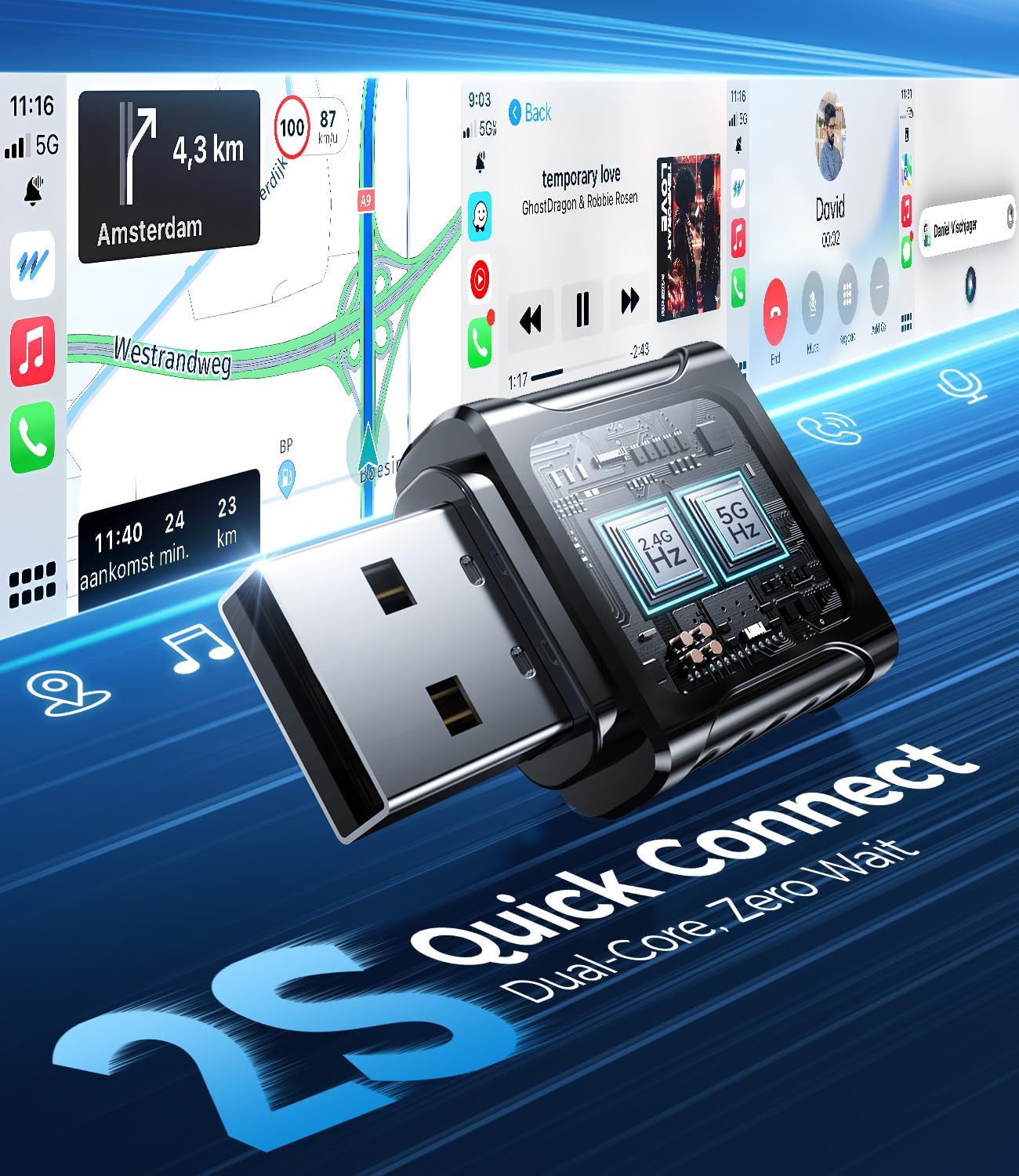 - 👑【Ultra-Mini USB Design】A revolutionary 70% size reduction, redefining in-car aesthetics! This coin-sized design seamlessly integrates into the USB port for a completely invisible installation. Designed for drivers who demand a clean and minimalist cabin—no need to sacrifice any space, eliminate the annoying noise of tangled cables and dangling devices. Watch it vanish into your dash while gaining instant wireless freedom This isn't just an upgrade; it's a custom fit for your car.