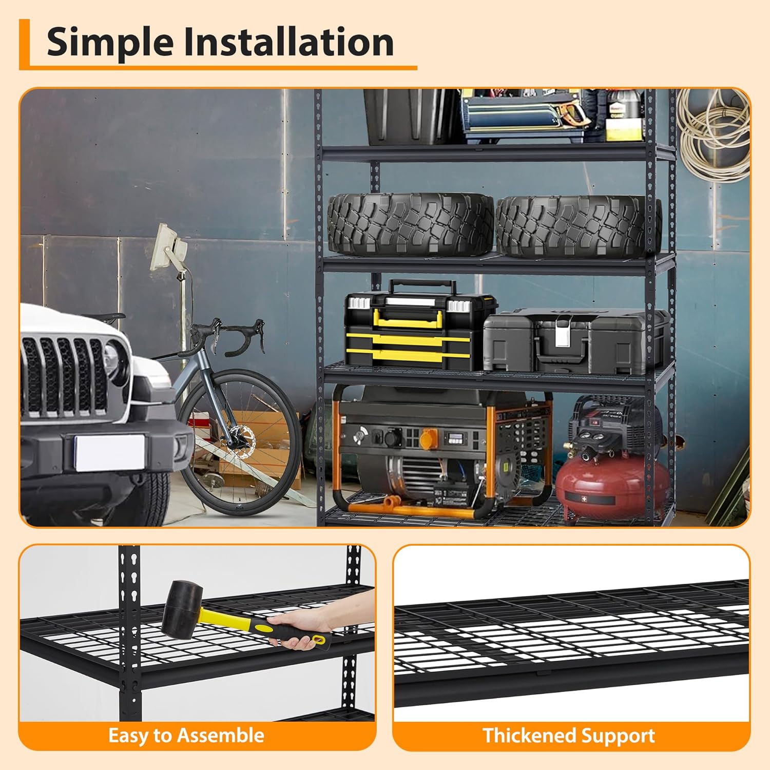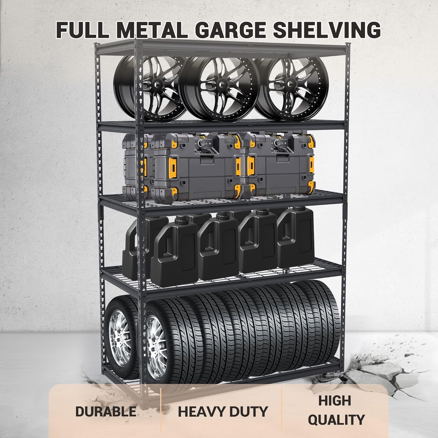 - 【5-Tier Storage Shelves】Each shelf holds up to 400 pounds (evenly distributed), with a total maximum load weight of 2000 pounds, making it ideal for garages, basements, workshops, and more.