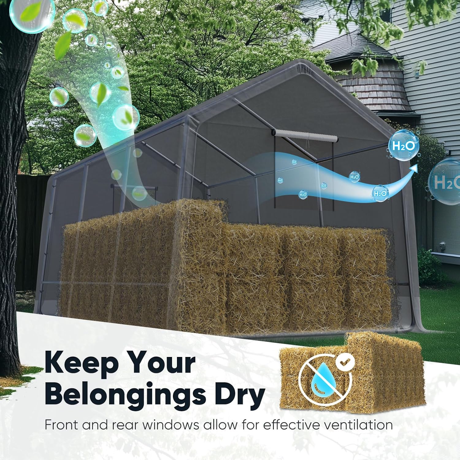 - 【Roll-up Ventilation Windows Design】There are 1 mesh roll-up windows on each door + ceiling airflow channel prevent condensation buildup. ideal for storage Lawn mower and other tools.