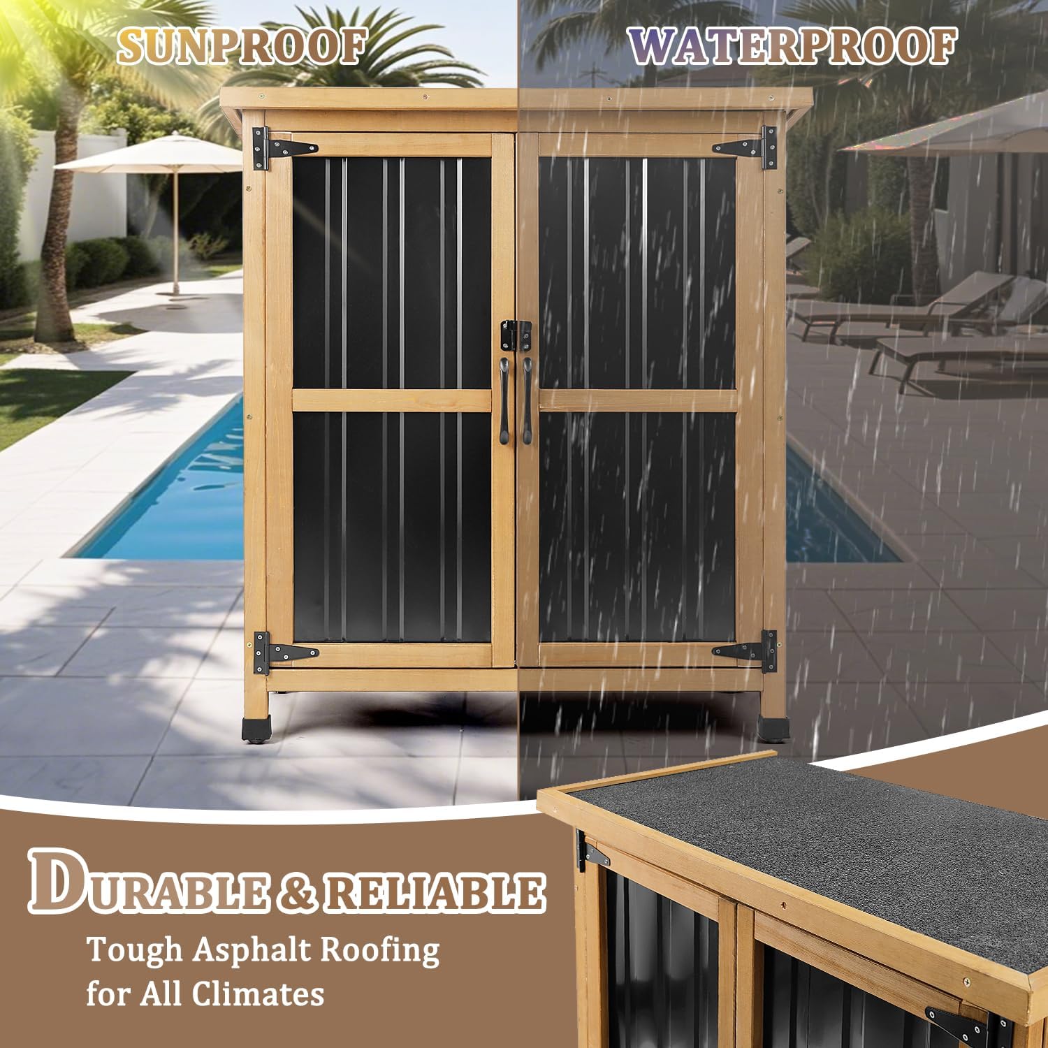 Weatherproof Outdoor Storage Cabinet with Lockable Doors, Wood & Metal Garden Storage Shed Patio Storage Box for Tools & Lawn Equipment, Pool Accessories