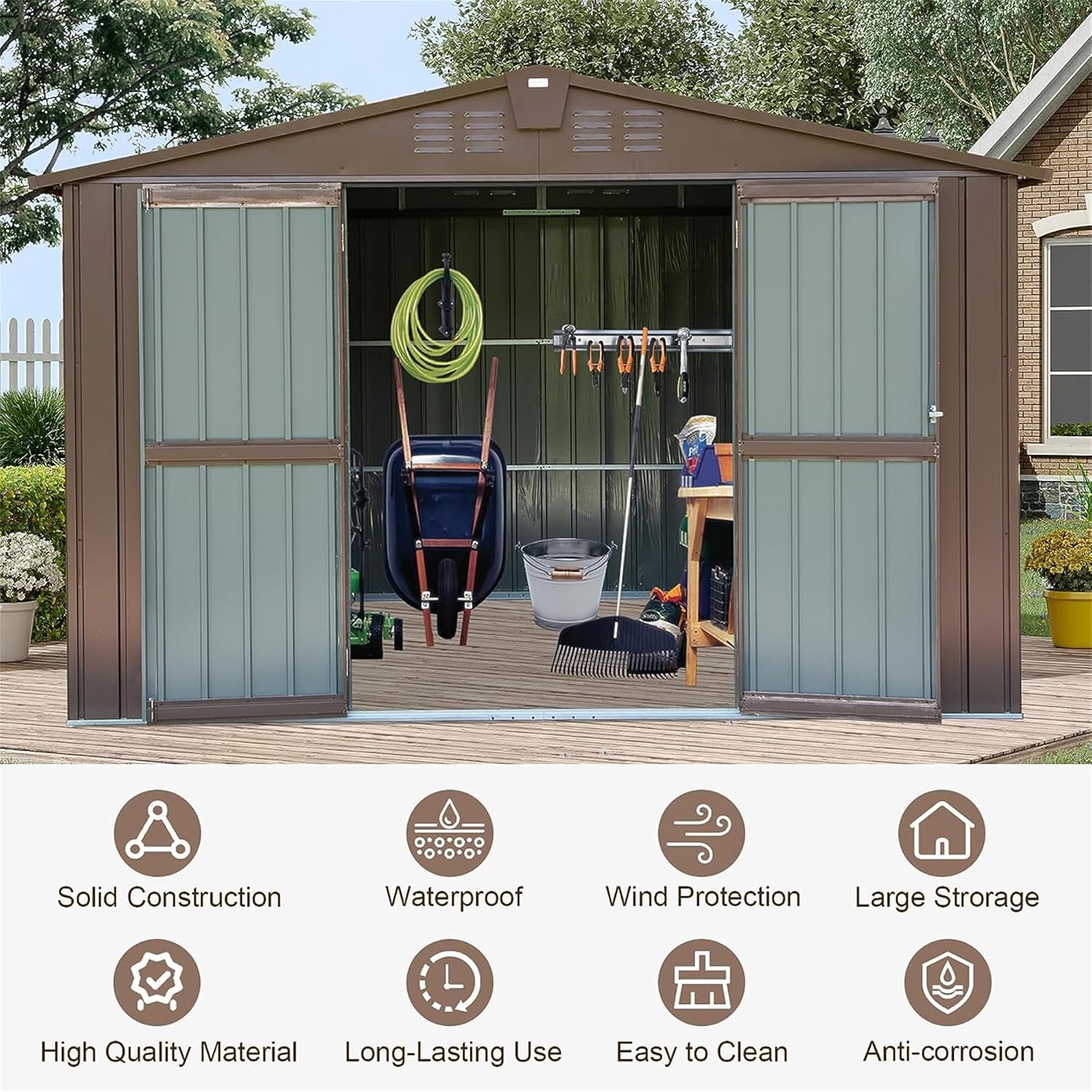 IKERY Metal Storage Shed - 10' x 8' with Double Lockable Doors, Large Garden and Backyard Tool Shed for Bikes, Weather - Resistant, Brown