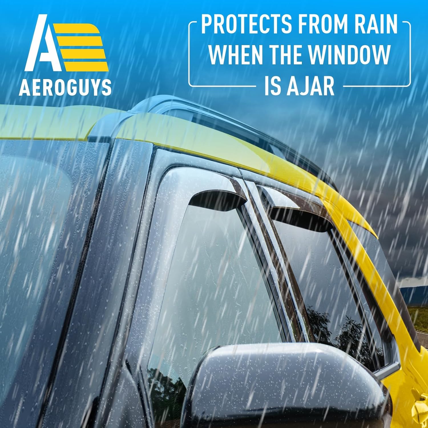 - No Tools Needed, Quick and Easy Assembly β These rain guards are very easy to fit. IN-CHANNEL INSTALLATION provides perfect fit for your car. Just slip it onto your carβs window and your job is done within minutes. There is no drilling or no tools required. Be sure that AEROGUYS window deflectors are water resistant, sun protective and will not bend, break or crack regardless of the weather conditions.