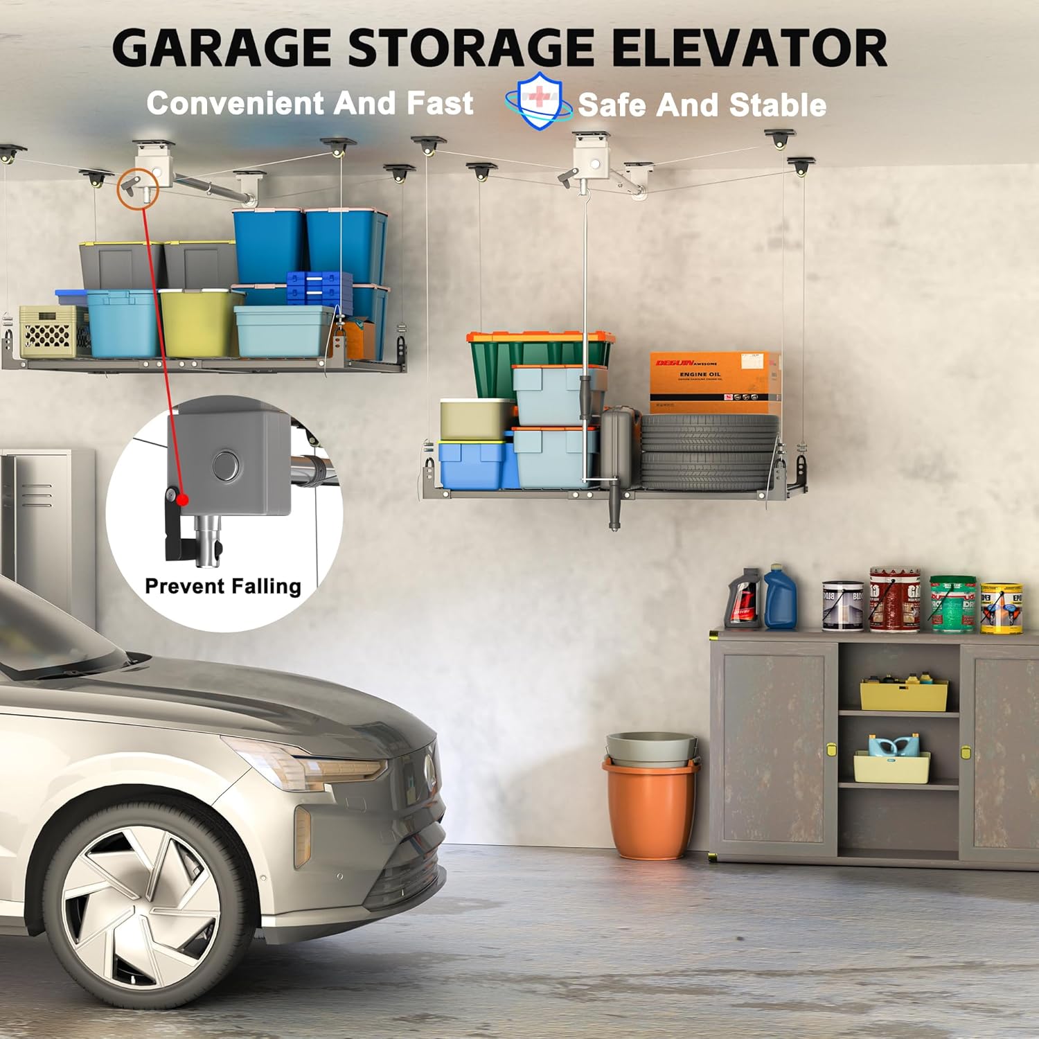 - ADJUSTABLE LIFTING SYSTEM: The maximum lifting range is 130",and the suitable ceiling height is less than 13 feet.The ceiling storage elevator system is designed with cable pressure rivets to ensure safe connection and prevent shelves from falling off.Through rigorous professional safety and durability testing,we ensure a long and long-lasting service life.
