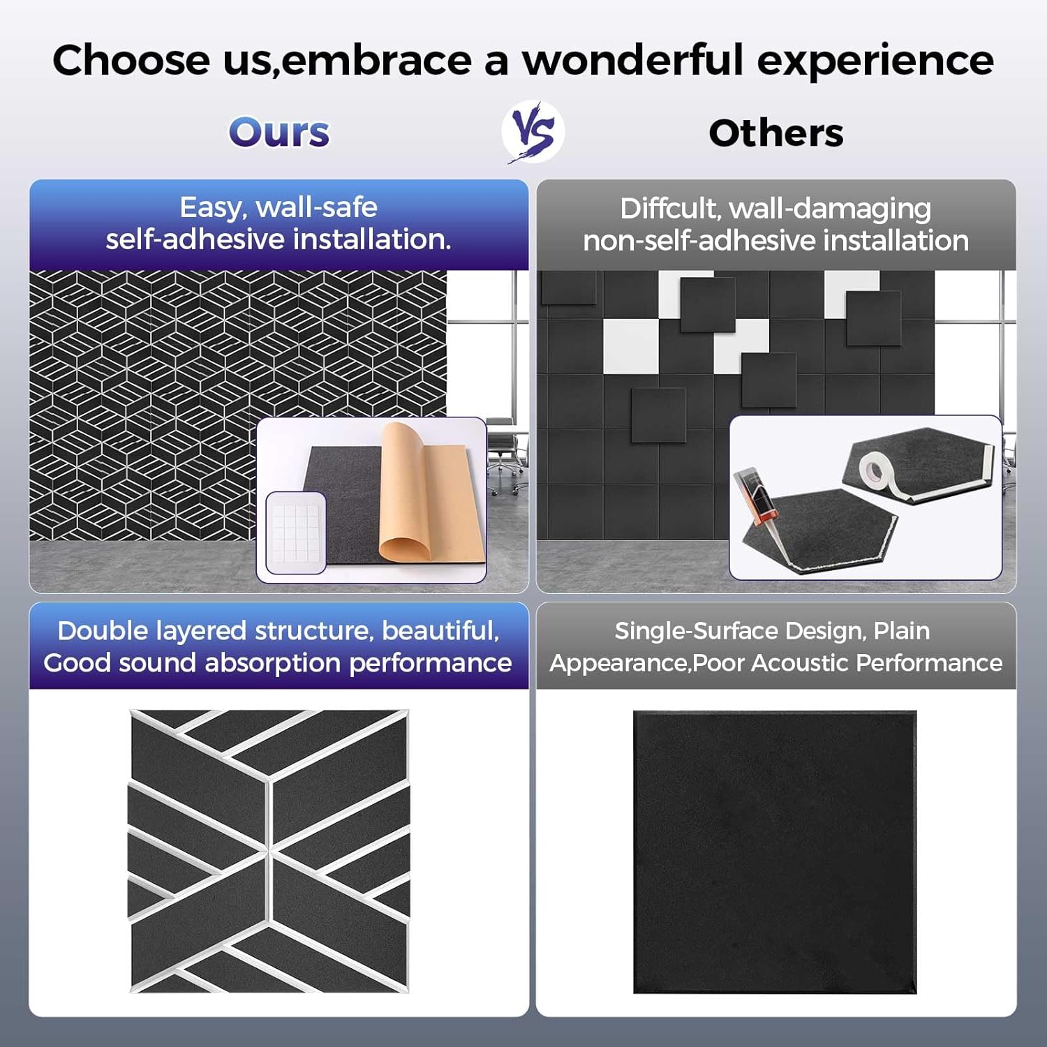 - Easy to Install/Remove: The acoustic panels sound absorbing adopt a self-adhesive design and can be installed on various surfaces without any tools, it can be installed on a variety of different surfaces such as walls, doors and ceilings. Just tear off the first layer of double-sided tape, no additional glue is needed, and it will not leave traces when removed. Save time and money. Spare double-sided tape is provided to ensure you have flexibility during installation.