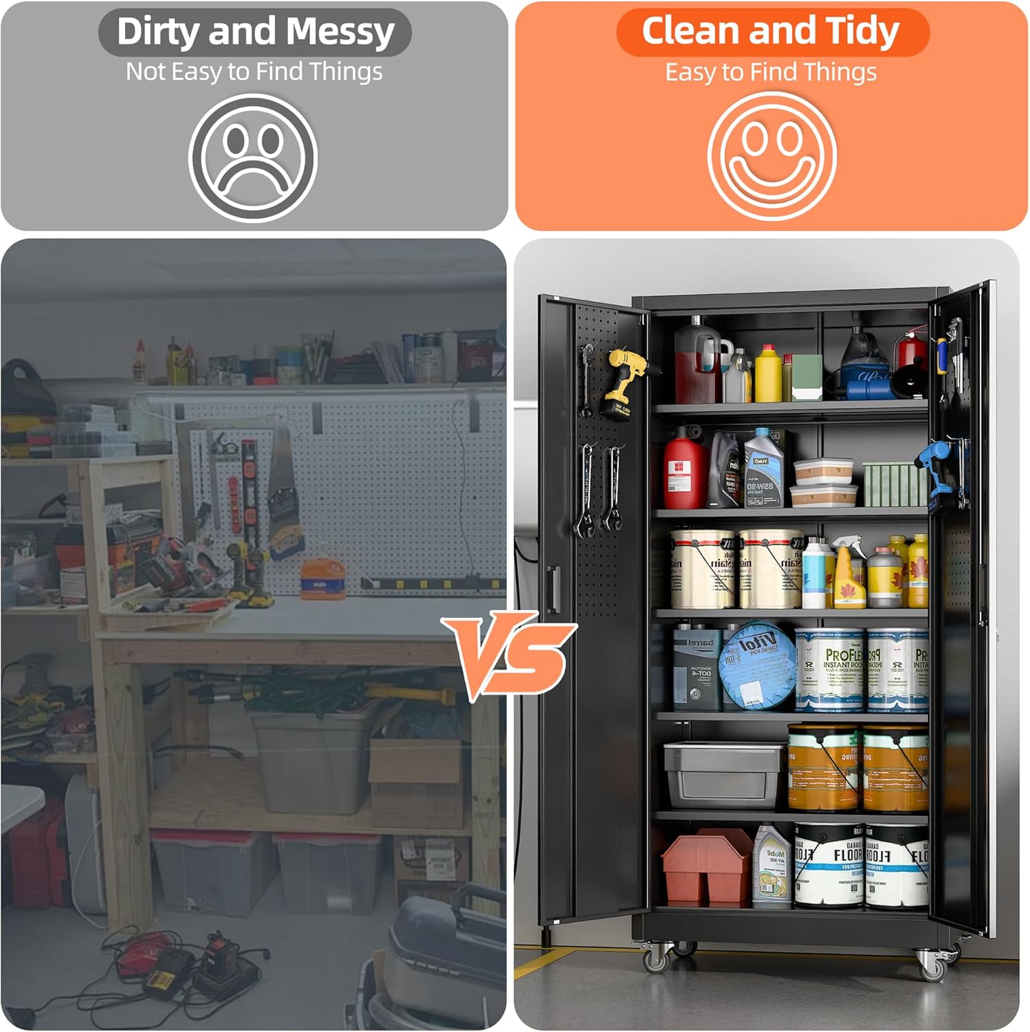 - Simple Assembly and Reliable Customer Support: Setting up the Garage Storage Cabinet with Wheels is a straightforward process, thanks to the clear assembly instructions and all necessary hardware included. Even if you're not an experienced DIYer, you can have the cabinet up and running in no time. And if you encounter any issues or have questions during assembly or use, our dedicated customer service team is always ready to assist you, ensuring a hassle-free experience from start to finish.