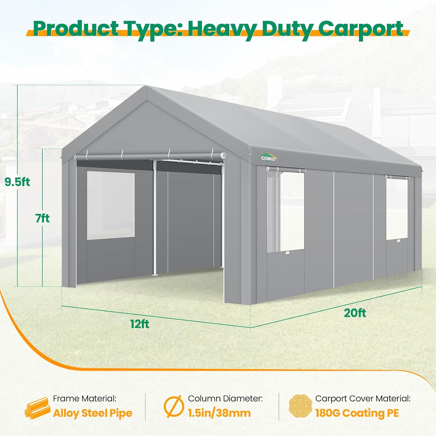 COBIZI Carport Canopy 12x20 Heavy Duty Portable Garage with Removable Sidewalls & Doors, Galvanized Frame Car Port Canopy Tent Waterproof with Built-in Sandbags for Car Boat Truck, Gray