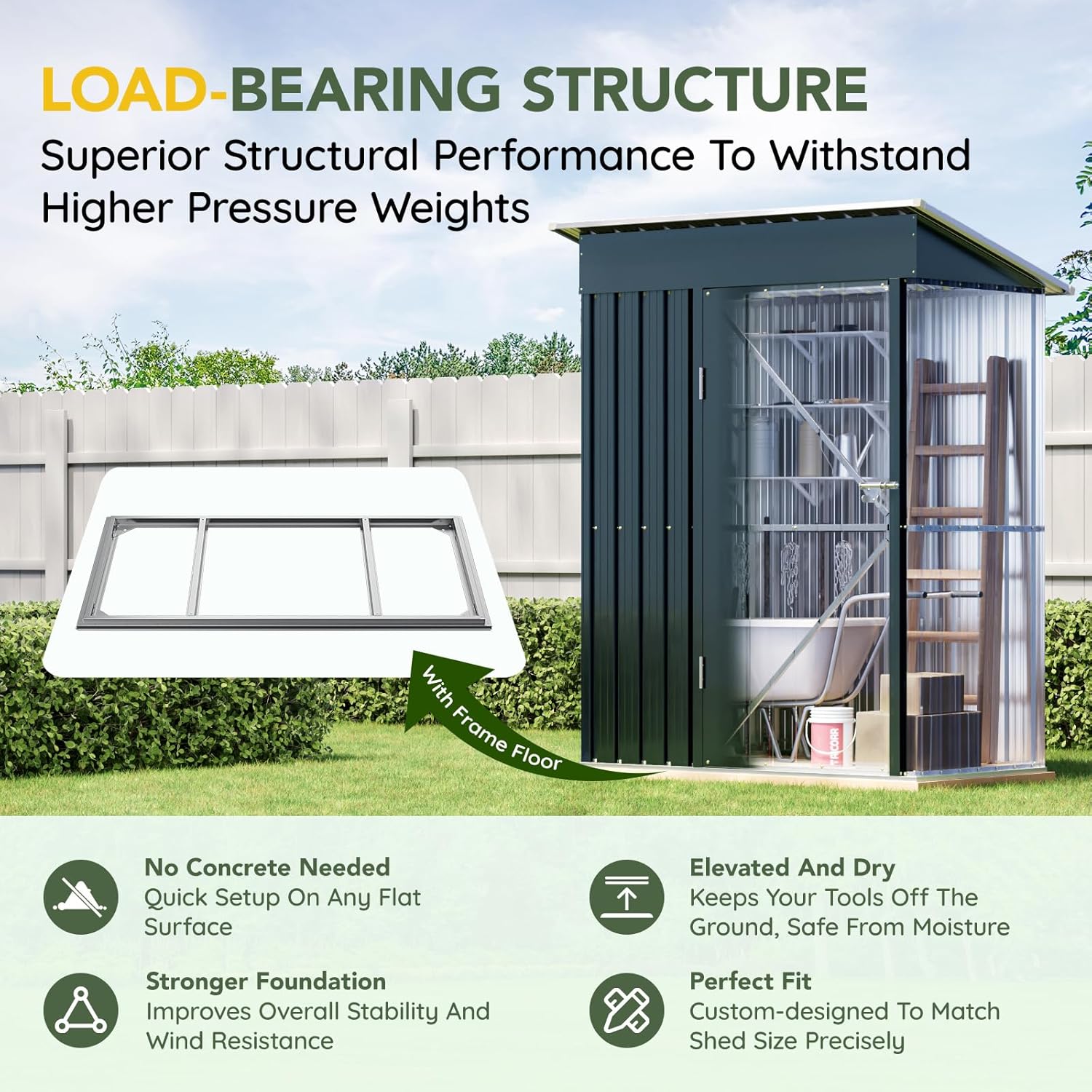 - Includes Reinforced Steel Base Frame – Comes with a pre-engineered steel base that provides a stable and level foundation, making installation easier and enhancing the shed’s overall structural integrity. Simply add plywood or concrete blocks on top for a complete floor.