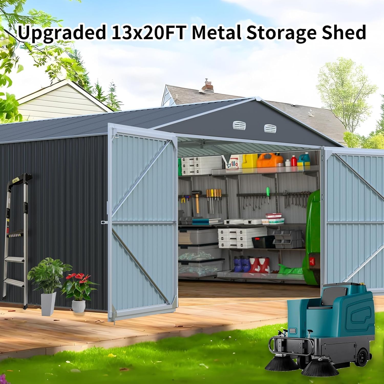 - Secure and Robust Metal Storage Shed for Safety: Engineered with a steel tube support frame and reinforced galvanized steel, our 13x20FT metal shed is built to last. The lockable design adds an extra layer of security, keeping your belongings safe and well-organized within the storage shed.