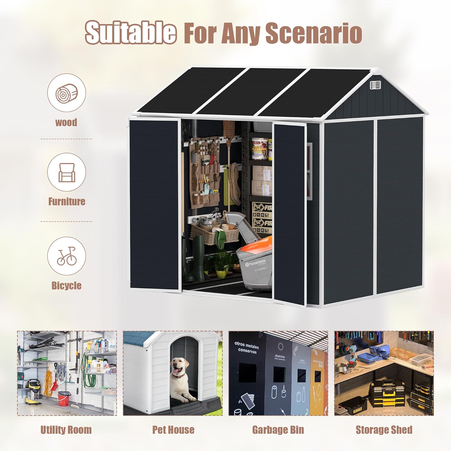 8x7 FT Outdoor Storage Resin Shed with Floor,Waterproof Plastic Garden Bike Shed with Lockable Door, Sloped Roof, Vents & Windows, Easy Assembly Tool Shed for Lawn, Backyard, Patio, Black