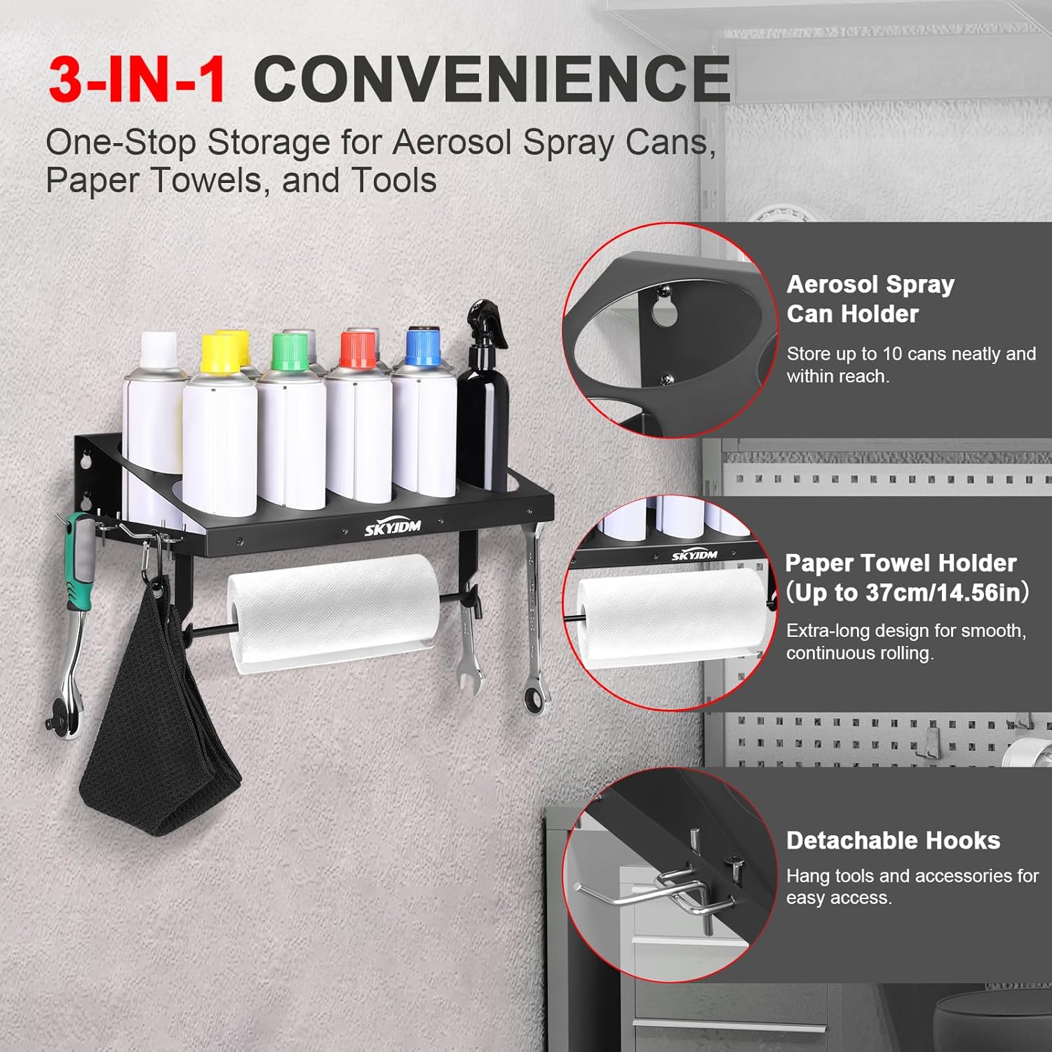 - 3-in-1 Space-Saving Organizer: Consolidate spray cans, tools, and paper towels into one sleek rack—free up counter space and keep everything within arm’s reach for faster workflows