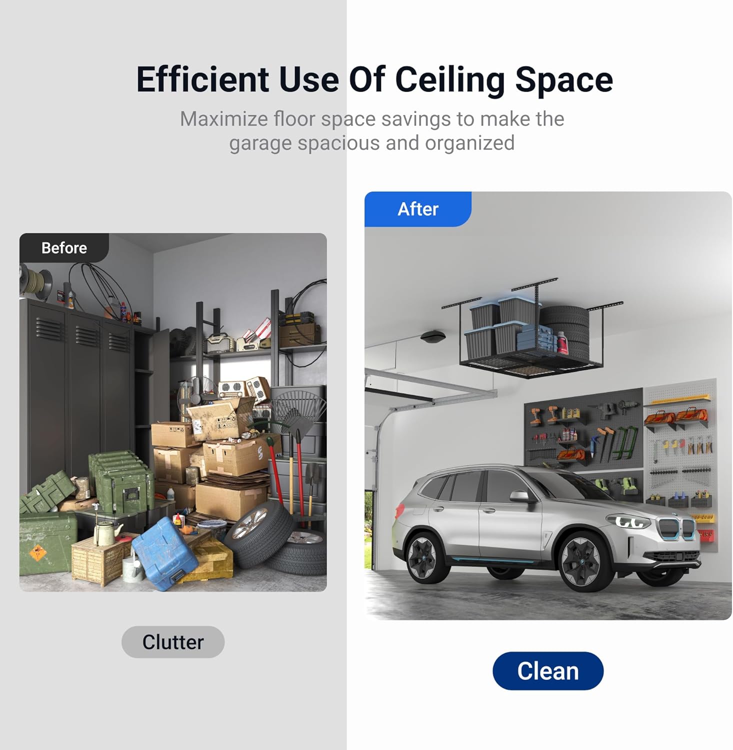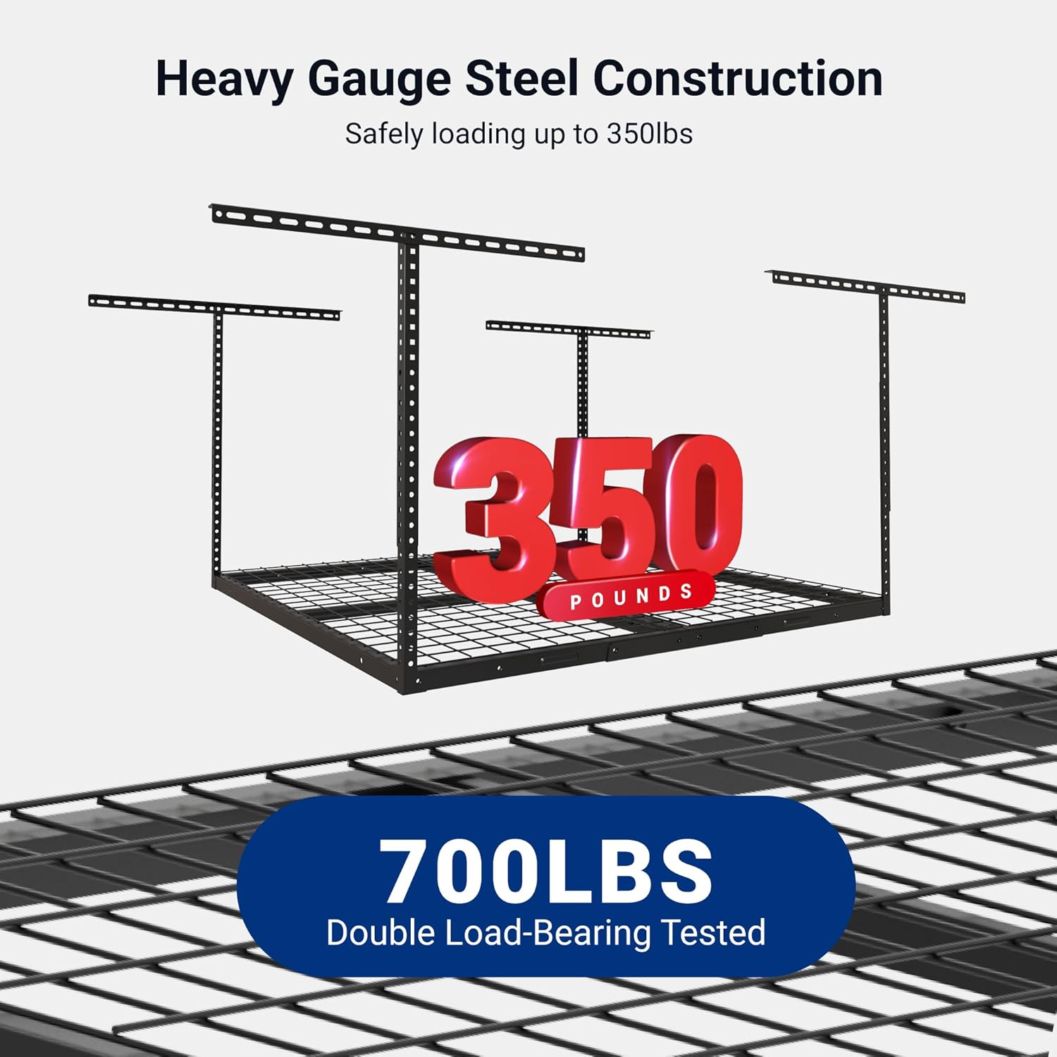 - 700 lbs Tested, 350 lbs Rated: Our overhead garage storage rack undergoes rigorous double load testing (700 lbs) to ensure unmatched safety and durability, supporting up to 350 lbs for your tools and equipment.