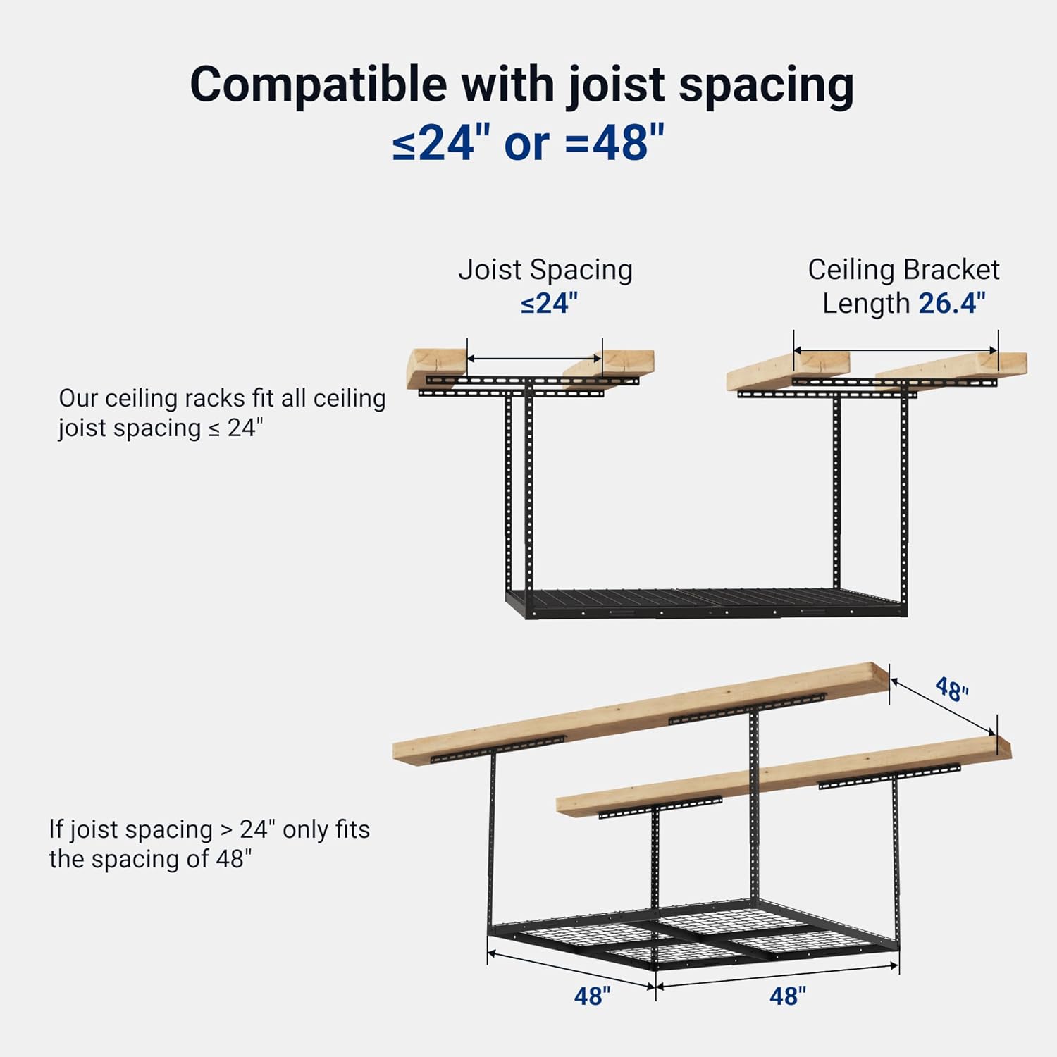- DIY Installation: More suitable for customizable combinations and installation in small spaces. The installation template helps with planning. This overhead storage rack fits all ceiling joist spacing of 24 inches or less. If the joist spacing is greater than 24 inches, it only fits ceiling spacing of 48 inches.