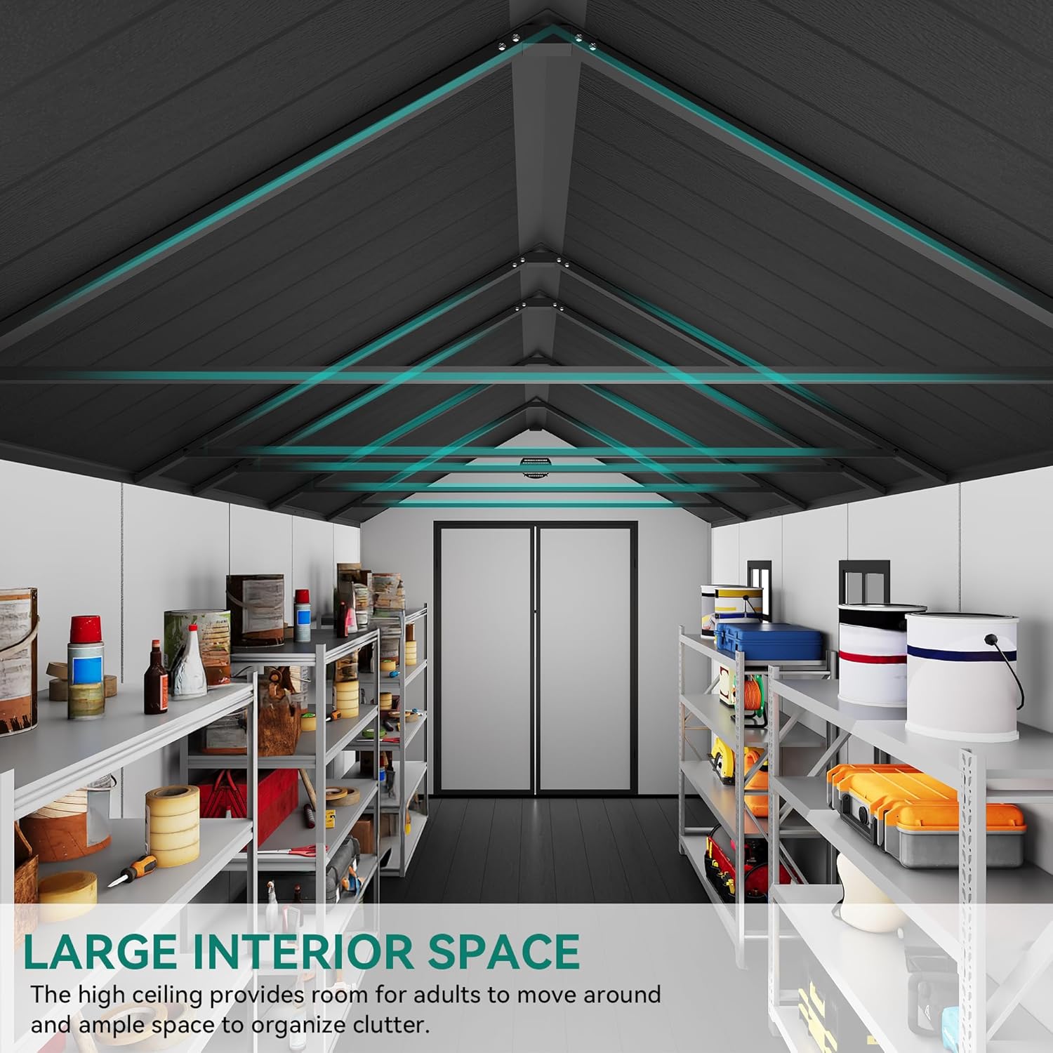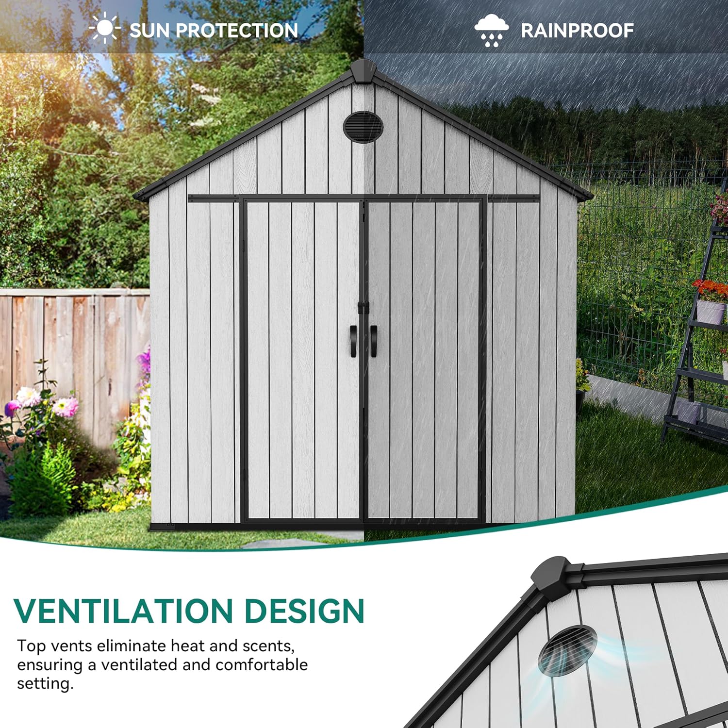 - Year-Round Peace of Mind: Crafted from 16mm thick PP resin panels with a sturdy floor, this all-weather garden tool shed protects your mowers, bikes, and tools from moisture and elements, keeping everything dry, safe, and organized in every season