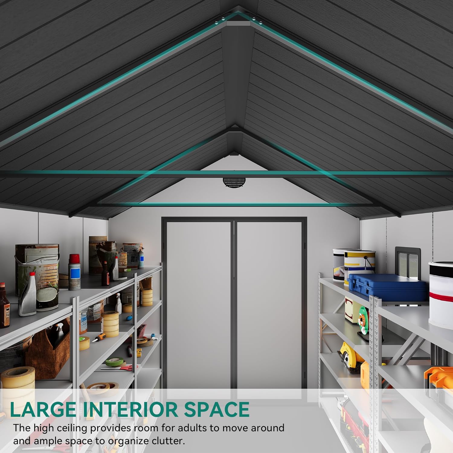 - Year-Round Peace of Mind: Crafted from 16mm thick PP resin panels with a sturdy floor, this all-weather garden tool shed protects your mowers, bikes, and tools from moisture and elements, keeping everything dry, safe, and organized in every season