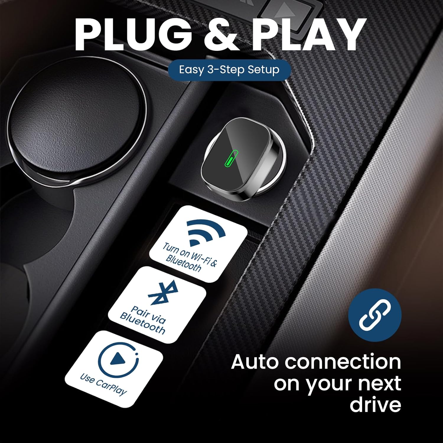 - 【Easy Plug & Play – Auto Connect Every Time】Set up in just three steps. Plug it in, pair via Bluetooth, and you’re good to go. After the first setup, this CarPlay adapter auto-connects instantly whenever you start the engine—effortless convenience every drive.