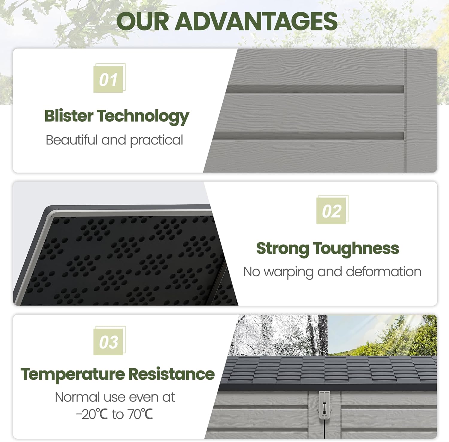 - Durable Resin Construction: This outdoor storage shed is made from premium resin using advanced thermoforming technology, giving it a lightweight appearance while maintaining exceptional flexibility and strength. Once assembled, the shed remains sturdy over long-term use, resisting fading, peeling, or cracking. Its robust design ensures reliable outdoor storage in all weather conditions