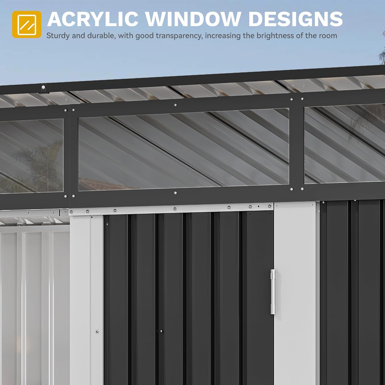 - Functional Sloping Roof: The outdoor bike storage shed features a sloping roof design to prevent rainwater accumulation; The 4 arcylic transparent windows make it convenient for you to see the items inside the shed, and a door for easy access and storage of larger items