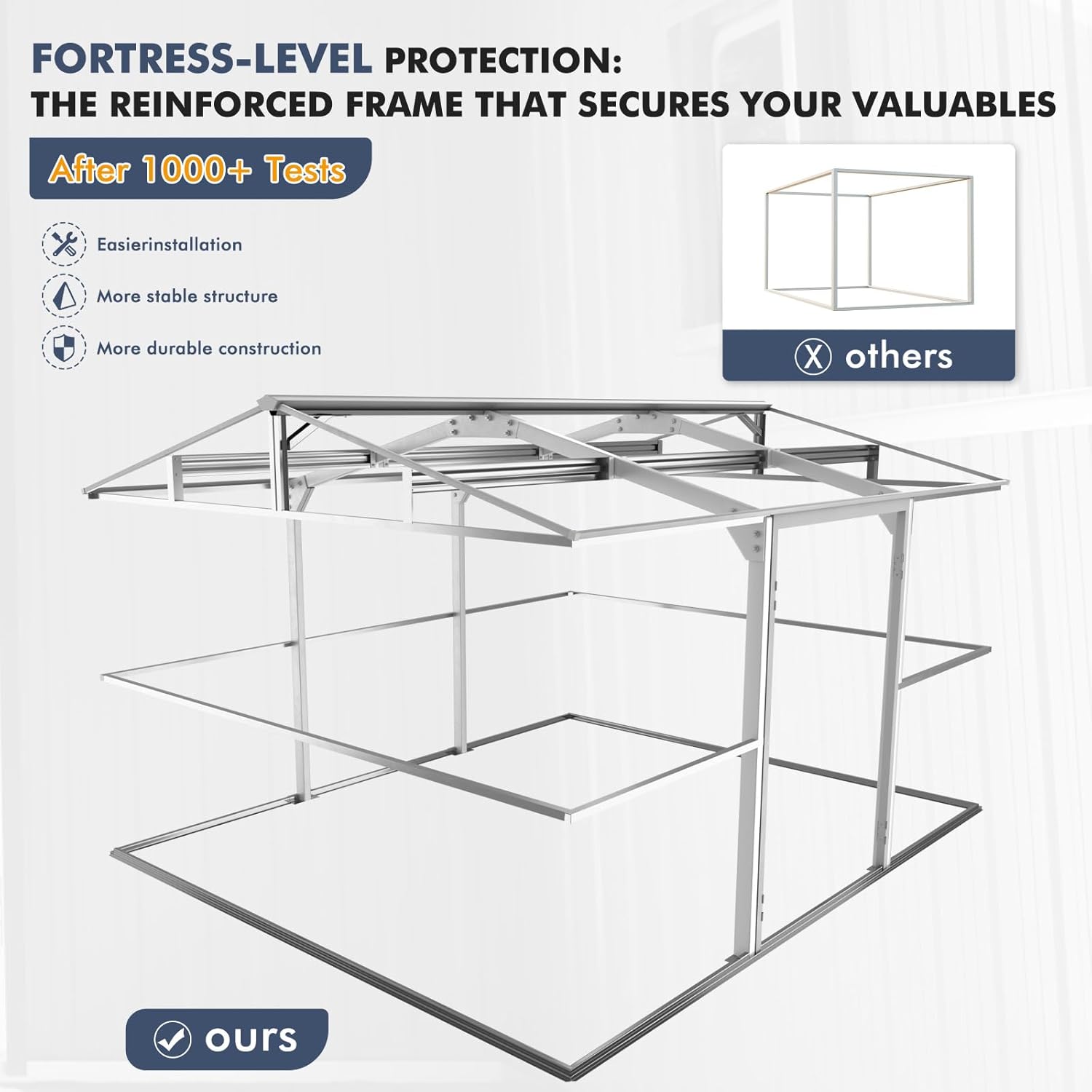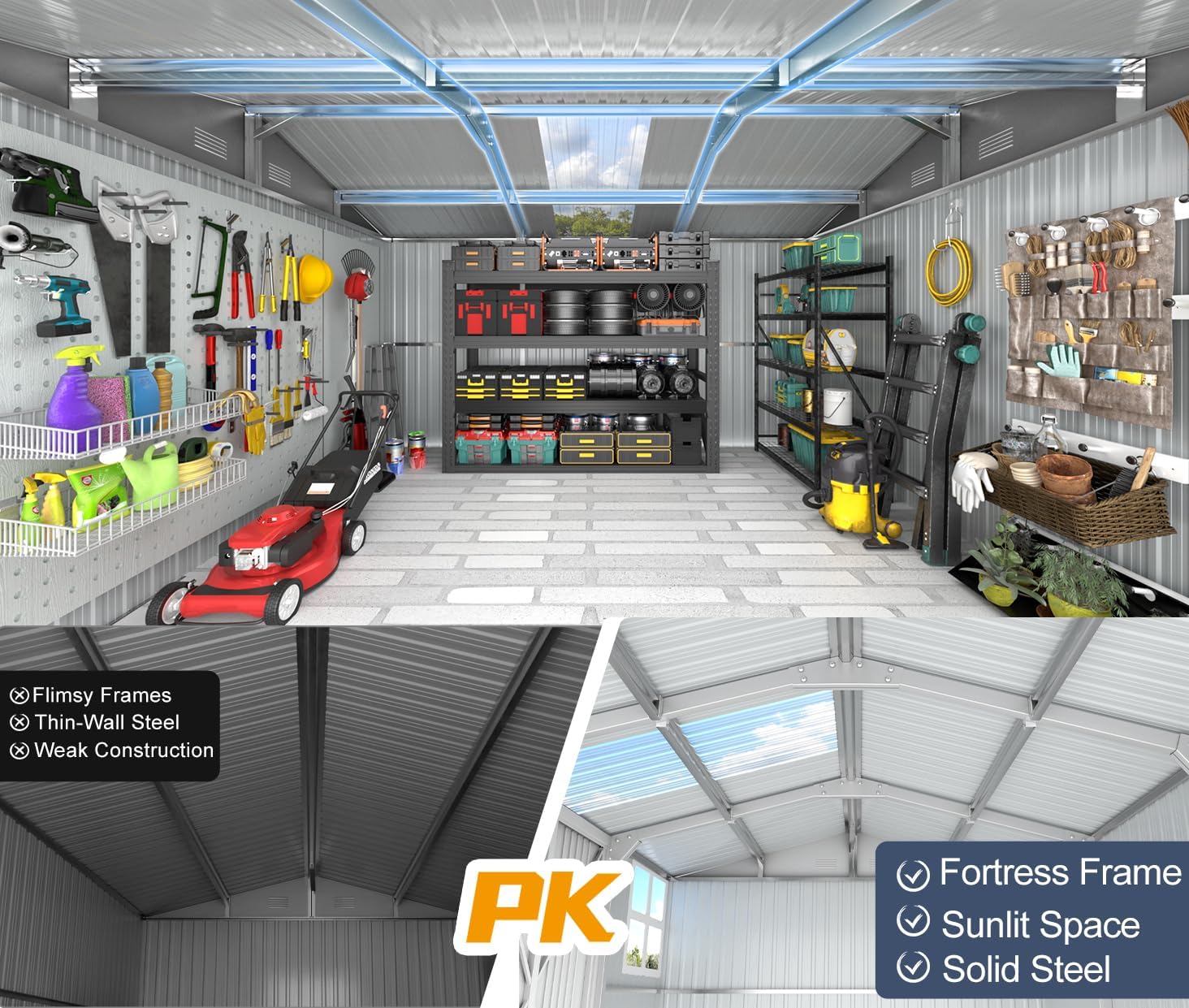 - 💪 Forged for Superior Strength: The skeleton of our shed is constructed from 0.6mm-thick (22-gauge) heavy-duty galvanized steel, far surpassing flimsy alternatives. We’ve engineered superior strength with an apex-braced roof and reinforced wall columns, creating a structure that fiercely resists warping and sagging. This is a true fortress for your valuable lawn mower, bikes, and equipment.