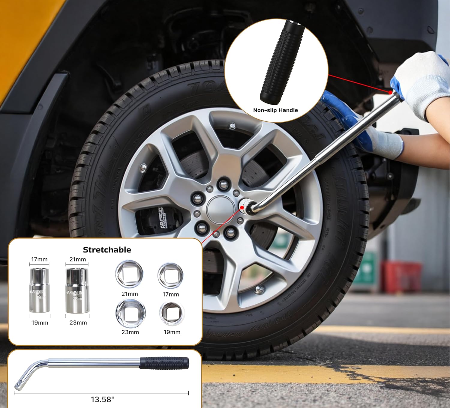 - 【Stable and Safe】LARBANKE car jack is made of Q345 steel plate, strong and durable, the top concave-convex non-slip design makes the user safer to use and will not damage the vehicle. The telescopic wrench handle has a non-slip design and is equipped with non-slip gloves, which saves the user's effort when using it.