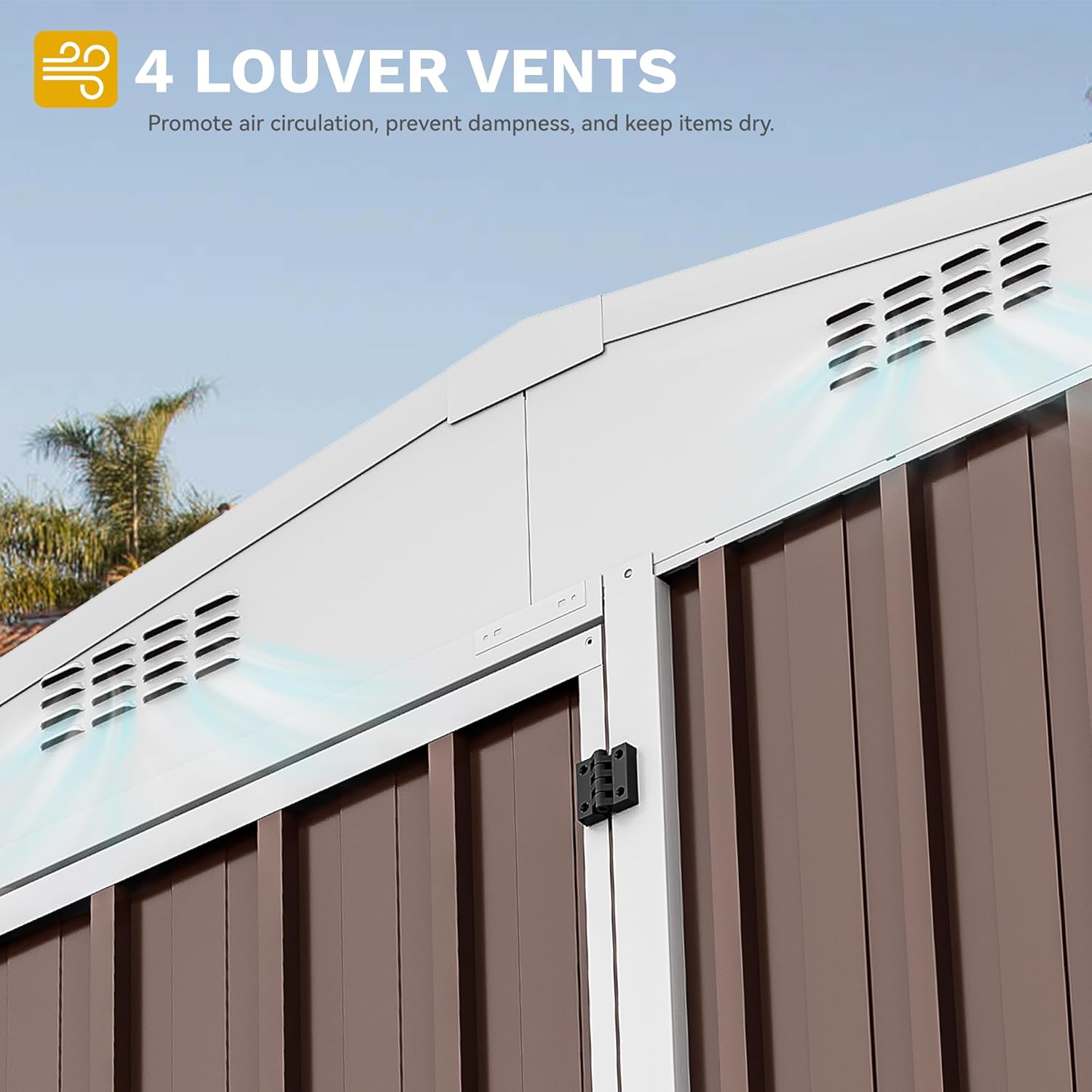 - Smart Roof & Airflow Design: With a slanted roof to shed rain and snow effortlessly, this metal storage shed keeps contents dry, while dual top vents ensure a fresh, breezy interior, suitable for storing supplies or nurturing plants