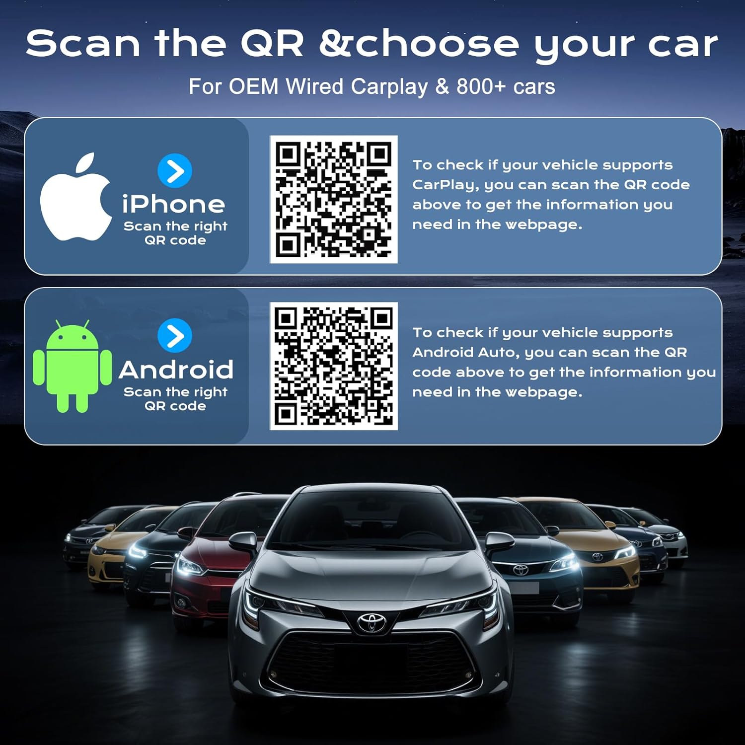 - Universal Compatibility:The USB wireless CarPlay adapter is compatible with more than 800+ car models.2 in 1 universal compatibility iOS & Android Auto.The wireless carplay adapter is compatible with iPhone 6 & later models running iOS 10 or above, as well as Android phones running Android 11 or above, enabling effortless switching between different operating systems