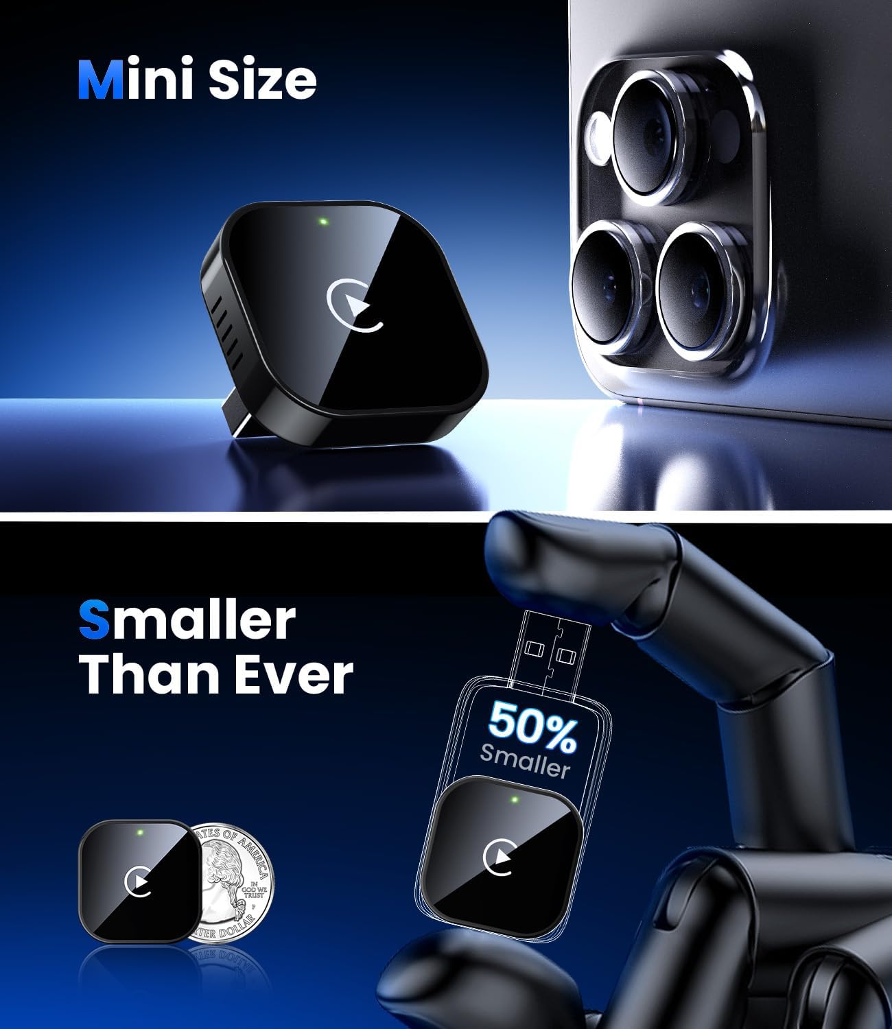 - π Revolutionary Mini Design, 50% Smaller β The ultra-compact and sleek Teeran wireless CarPlay adapter fits almost flush in your carβs USB port, blending seamlessly into your vehicleβs interior for a clean, minimalist look without clutter. With our upgraded, nearly invisible adapter, effortlessly add wireless functionality to your car's original Apple CarPlay and enjoy wireless access to CarPlay features like music, maps, calls, and more.