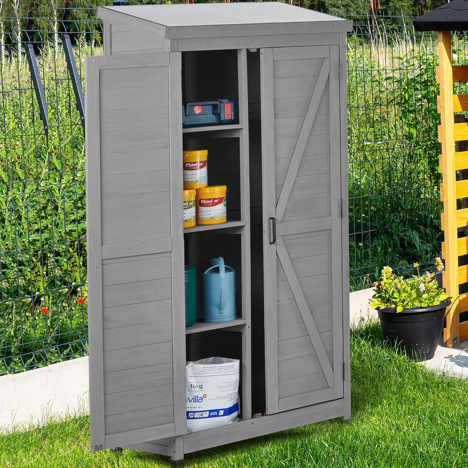 - Premium Solid Wood Construction: Our Gray 68 Inches Tall Outdoor Storage Shed is crafted from high-quality solid wood, ensuring durability and a stylish appearance that enhances your outdoor space while helping you Keep Your Yard Tidy.