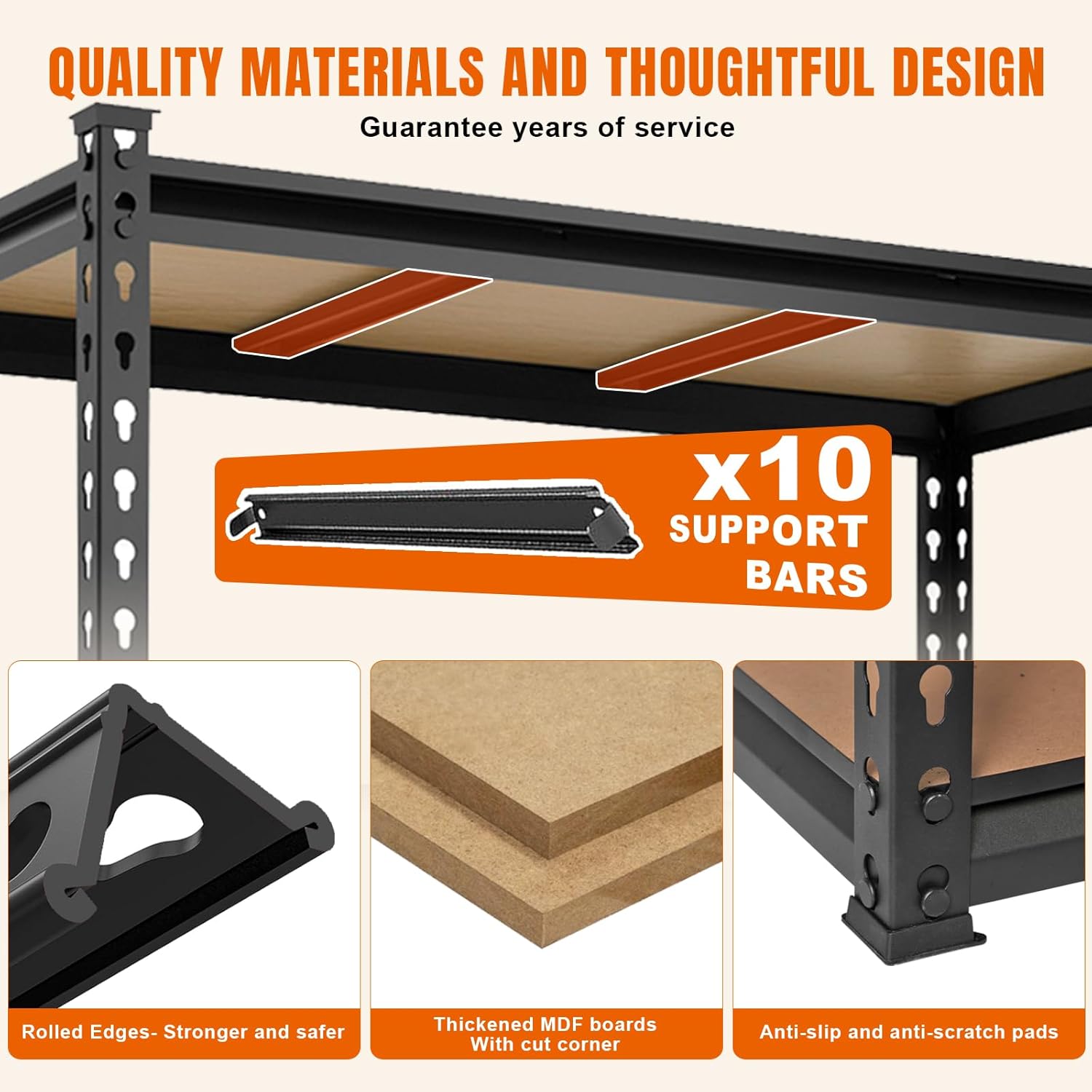 - Garage Shelving Heavy Duty Load 3000LBS: BIG RED storage shelves adopts rolled edge thickened columns, each metal shelving with support ribs. Made of high-quality metal frame+wood boards,so each shelf can hold up to 500 lbs, with a total bearing capacity of 2000 lbs, which makes 5-tier closet shelves more stable, solid and more stuff can be stored.