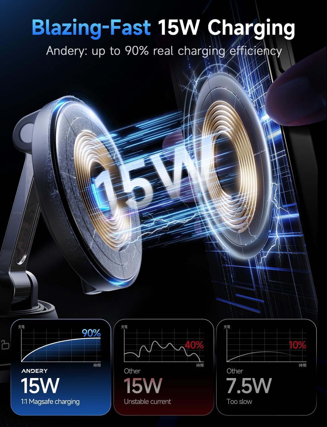- 15W Fast Charging with Dual Input & Intelligent Temperature Control: Our magnetic car mount delivers up to 15W fast wireless charging—over 100% faster than traditional 7.5W chargers—with dual input ports for more convenient power options. The precise 1:1 coil design ensures optimal charging alignment and efficiency above 75%. Lab tests show intelligent temperature control reduces device heat by 15% during continuous 2-hour charging, protecting battery health on long drives.