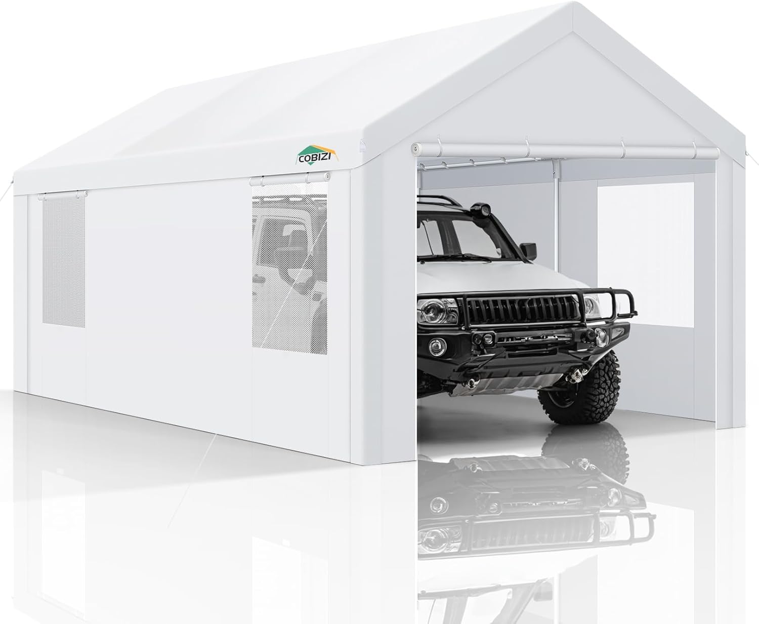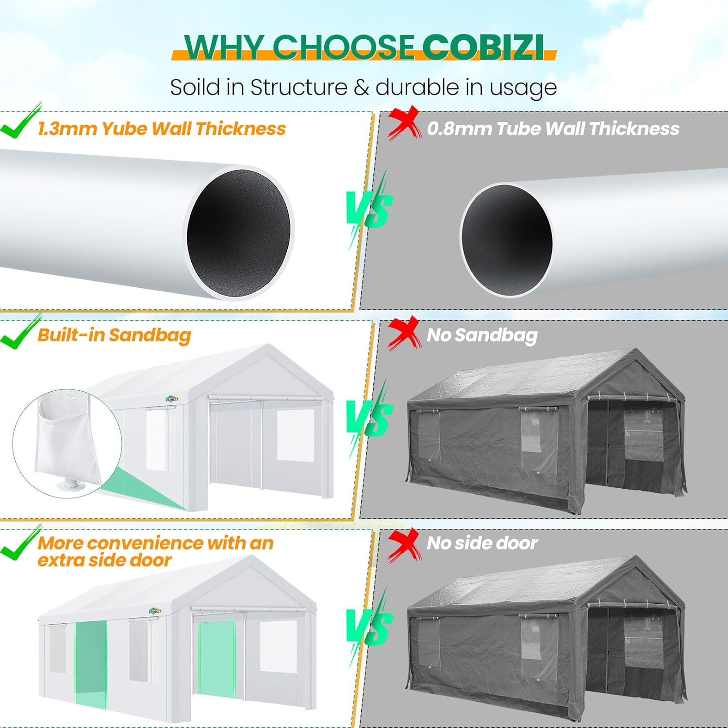 COBIZI Carports 10x20 Heavy Duty Car Canopy Garage with Removable Sidewalls & Doors, Galvanized Frame Portable Carport Canopy with Built-in Sandbags & All-Season Tarp for Car Boat Truck, White