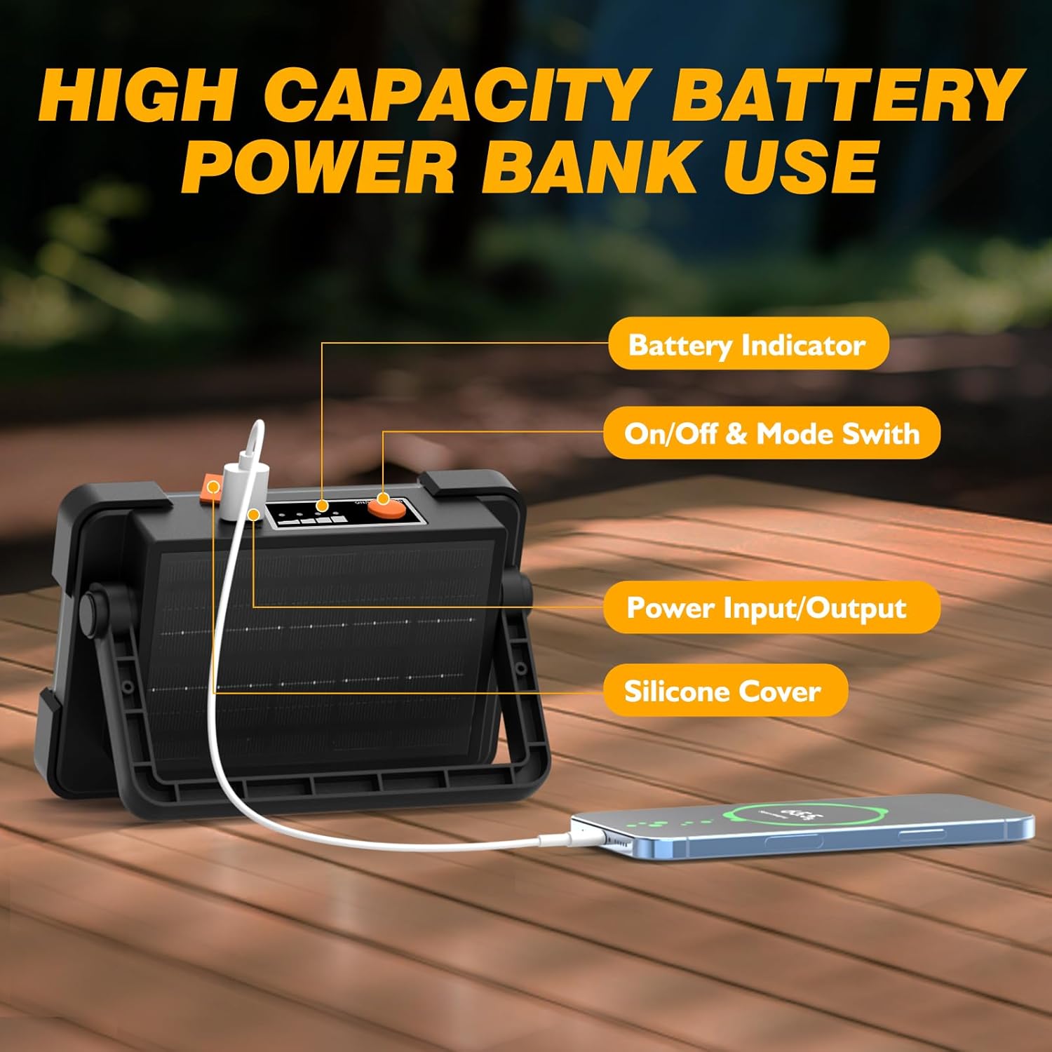 - 10000LM Super Brightness: Light up your workspace like never before! Our LED solar work light delivers 10000LM of ultra-bright lighting, powered by 144 high-efficiency LED beads and a high-transparency glass panel for optimal brightness. Whether you're working in a dim garage, on a nighttime job site, or during a power outage, this rechargeable work light cuts through darkness with ease