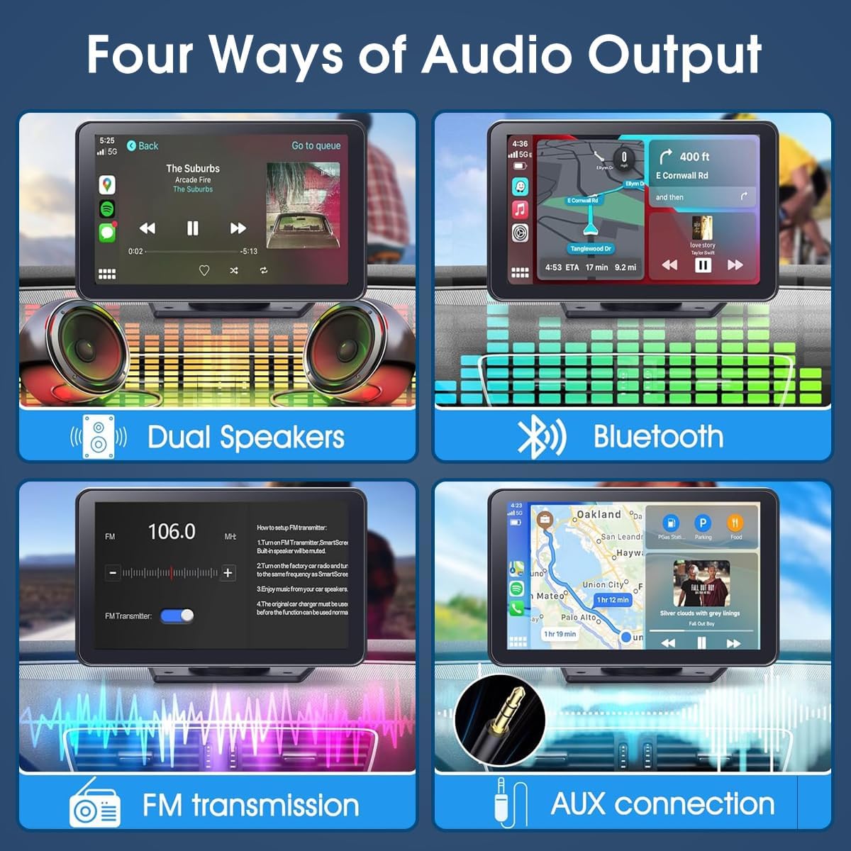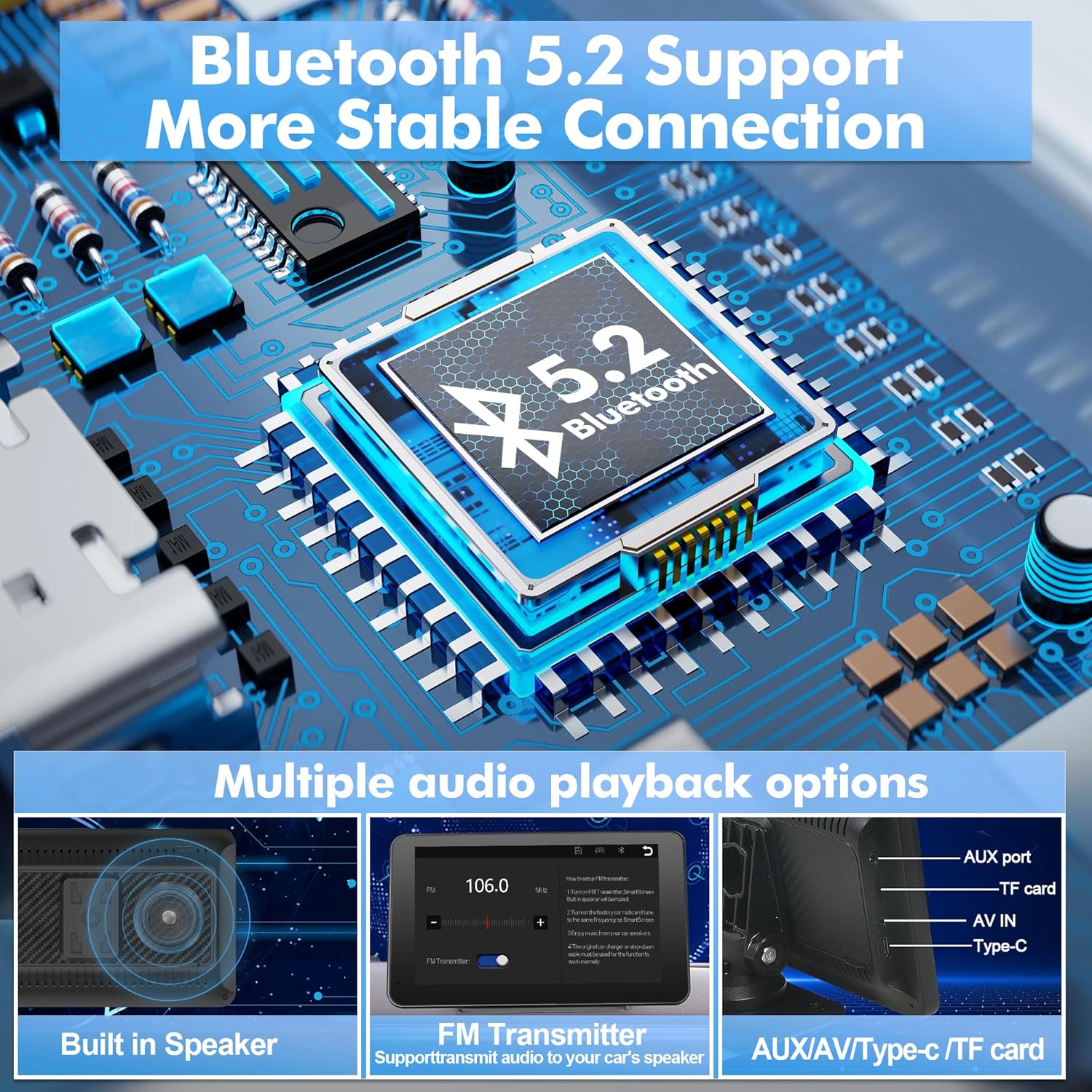 - 【Easy Installation & Portability】: This car play radio comes with a adhesive mount for easy installation; you can mount it to your dashboard with 90° adjustable. You can keep the car's original radio, and they can be coexist perfectly.Suitable for almost all kinds of cars, BMW, Audi, Chevrolet, Cadillac, Lexus, Ford, Toyota, Nissan, Buick, Jeep, Hyundai, etc