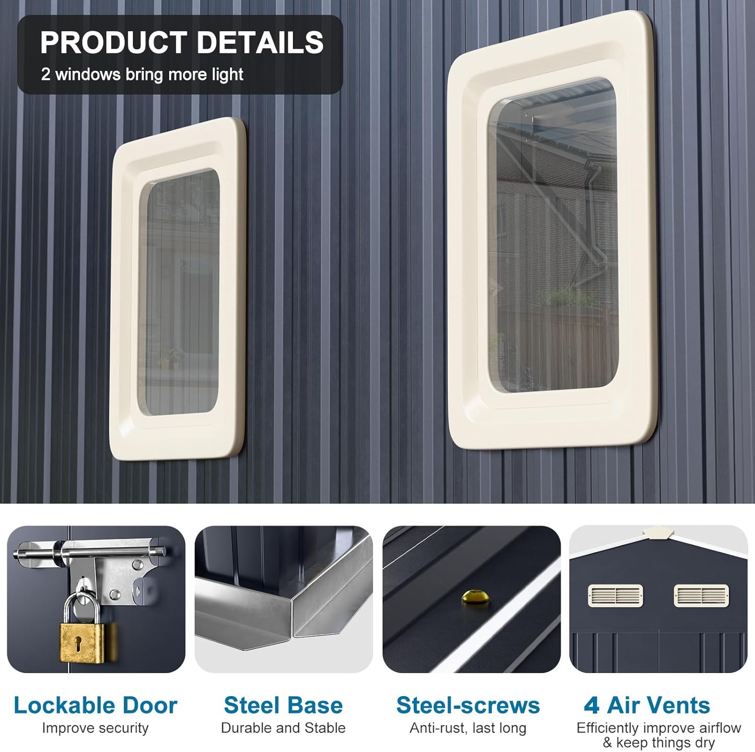 - Premium Durability & All-Weather: The metal storage shed is made from 0.25mm color steel plate & 0.6mm galvanized sheet. Includes unique reinforcement and 4 inland anchors, ensuring a solid overall structure capable of effectively resisting corrosion, oxidation, rain, and ultraviolet radiation. Lightweight and maintenance a breeze