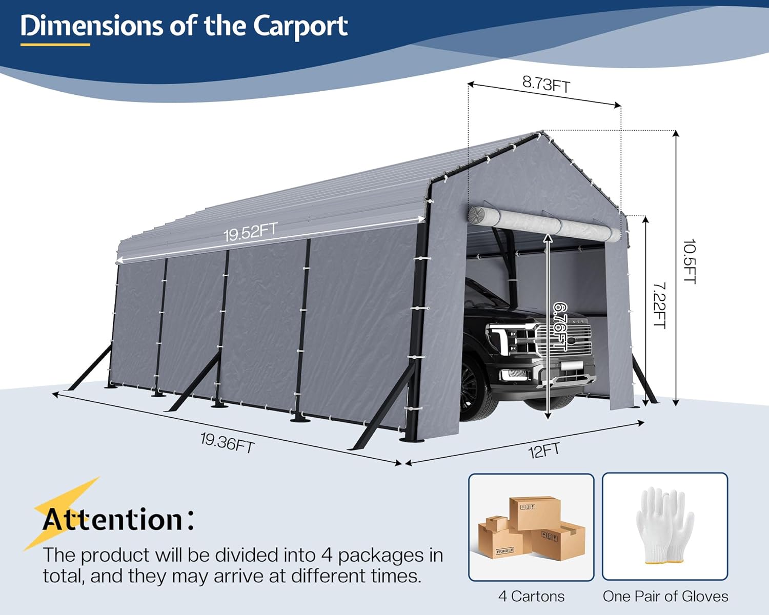 - Built for All-Season Performance: Our 12x20 carport features a galvanized steel roof, powder-coated frame, added roof bracings, and 3 diagonal supports on each side—delivering reinforced strength and stability to withstand wind, rain, and daily outdoor use