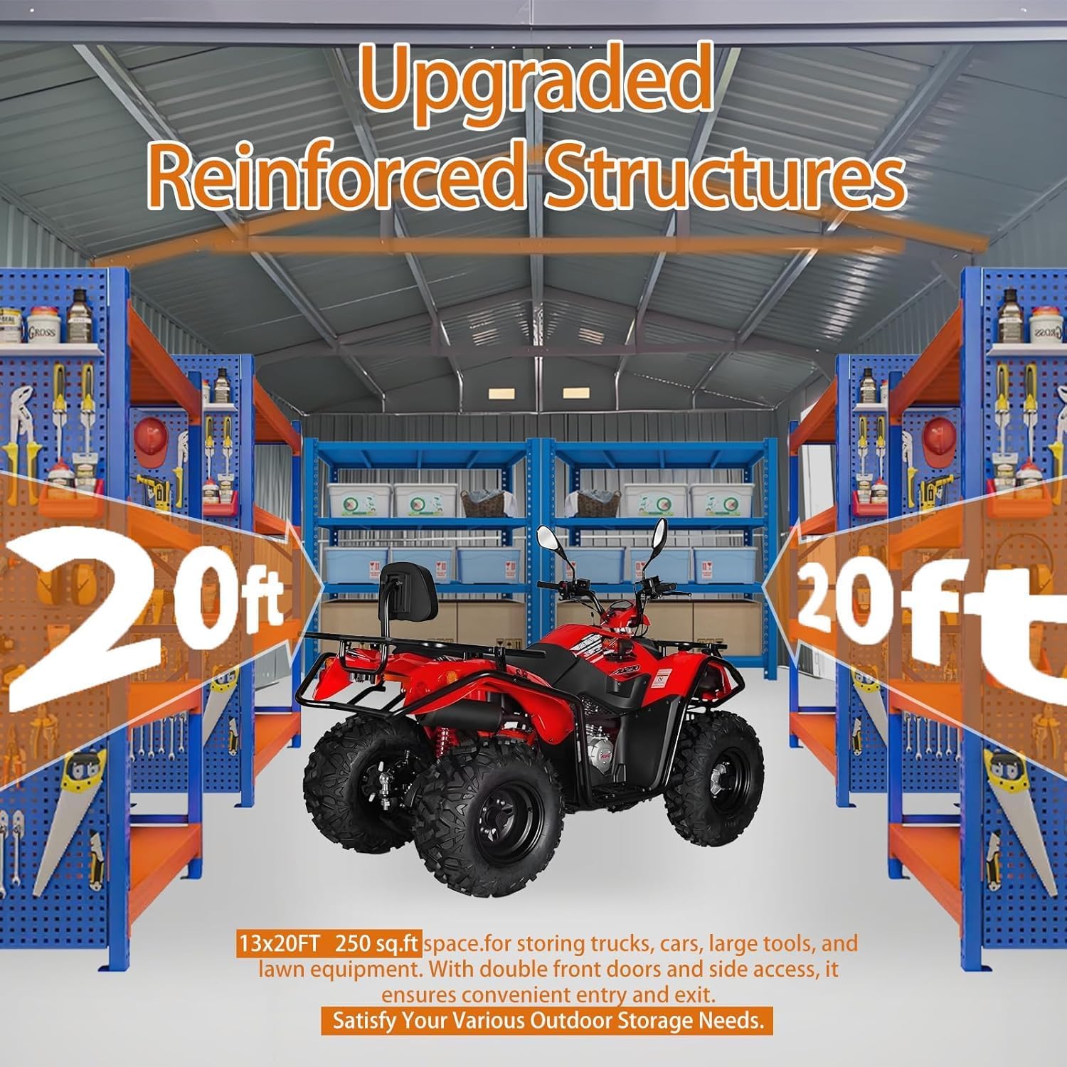 - Spacious Metal Shed for All Your Outdoor Storage: This storage shed provides an impressive 240sq. ft of walk-in storage space, perfect for cars, trucks, bikes and large equipment. The metal shed features durable galvanized steel construction with a powder-coated frame, duty metal shed design with 20lbs/sqft Snow Load Capacity and 50M/ph Wind Resistance. With double hinged doors and lockable security, this storage shed large keeps your belongings safe and organized.