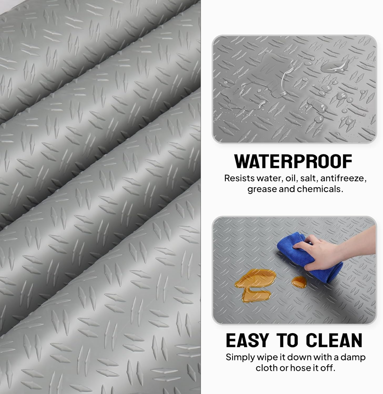 - 【Non-Slip & Effortless Cleaning】The diamond pattern on the surface provides max grip, providing a safe entry and exit for your vehicle.The waterproof PVC resists staining from dirt, mud, automotive fluids, and commercial chemicals. Effortless cleanup surface with vacuum, broom, wet cloth, or dry mop