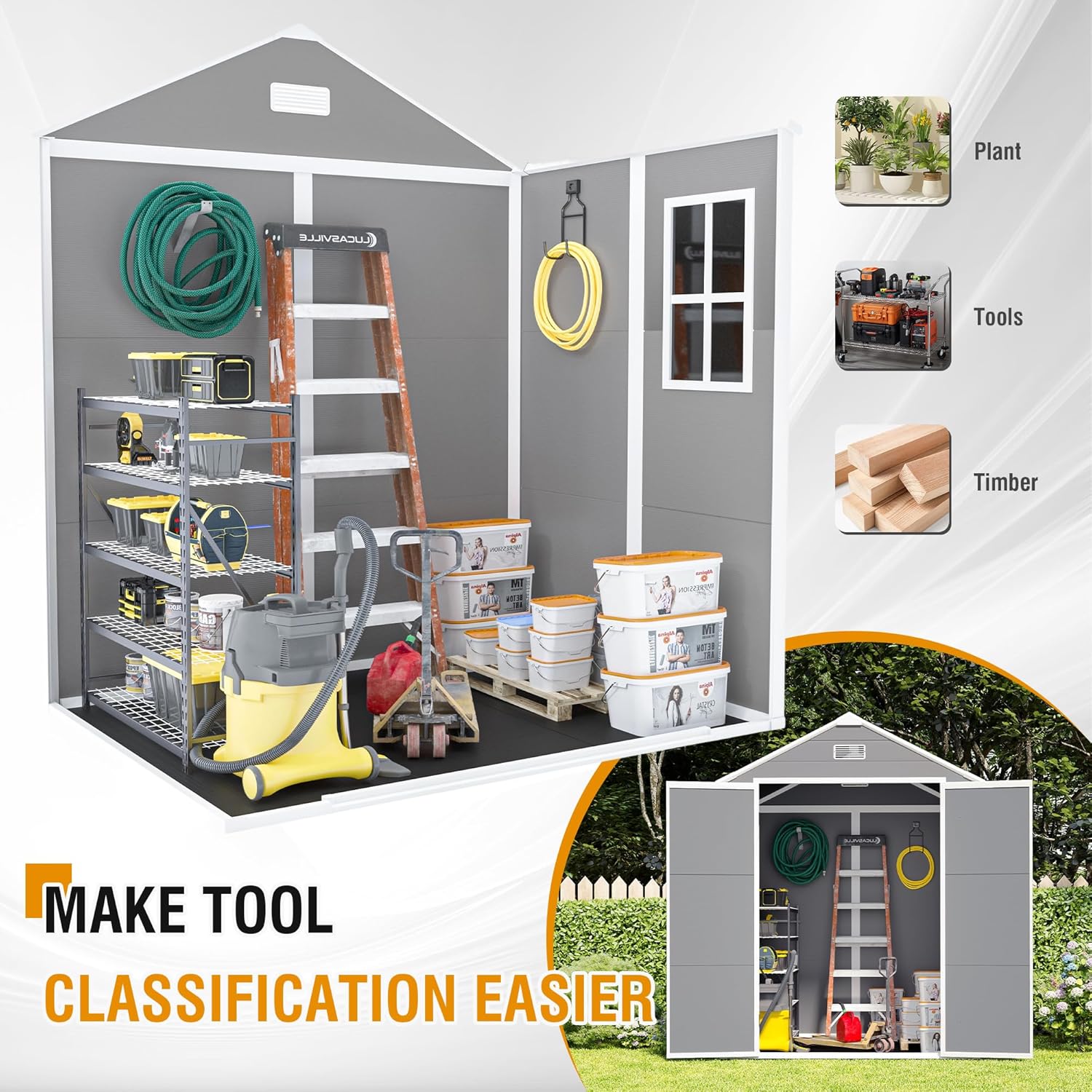 - đ ăIntegrated Vents & Clear WindowăDesigned for airflow and visibility, this garden shed features louvered vents above the door to enhance ventilation and reduce moisture buildup. A crystal-clear side window fills the interior with natural light, eliminating dark corners and making it easier to find your tools and supplies