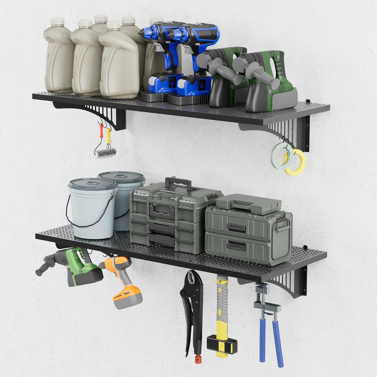 YOLENY 2-Pack 1.64x4FT Adjustable Heavy Duty Garage Wall Shelving, 500lbs Load Capacity Wall Mount Storage Shelf, Garage Storage Rack with Hooks, Metal Floating Shelves Organizer for Workshop